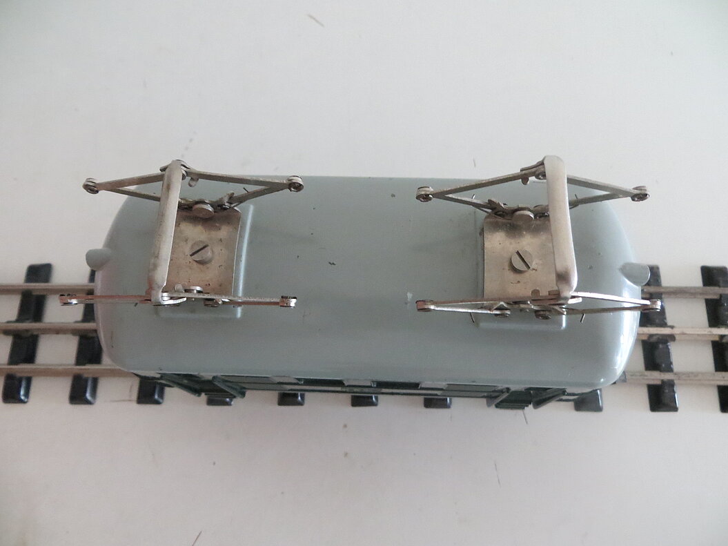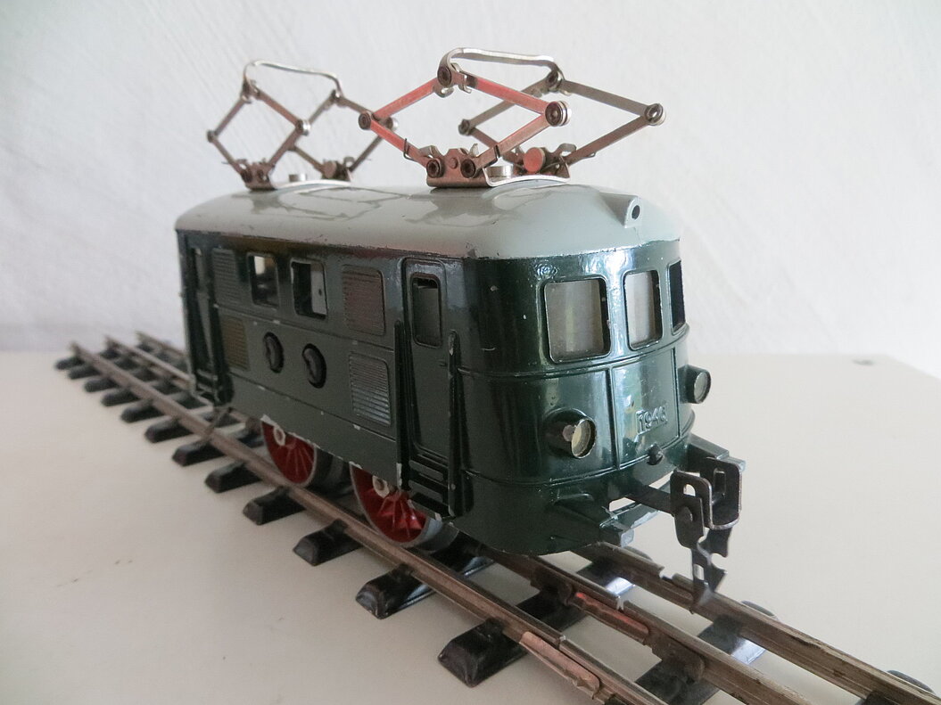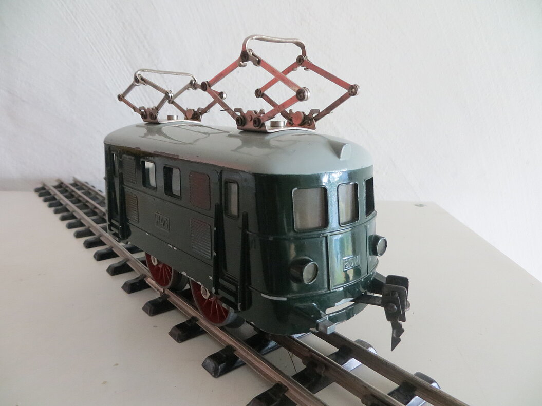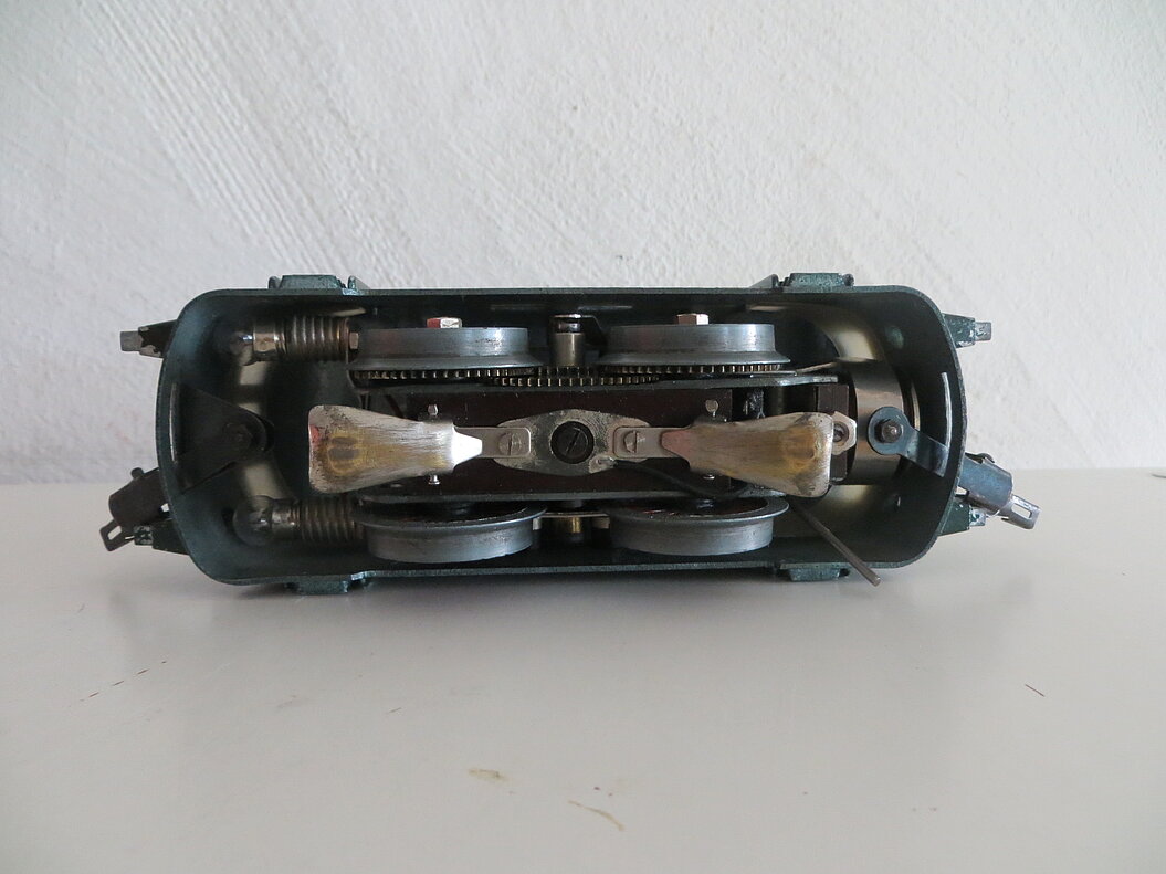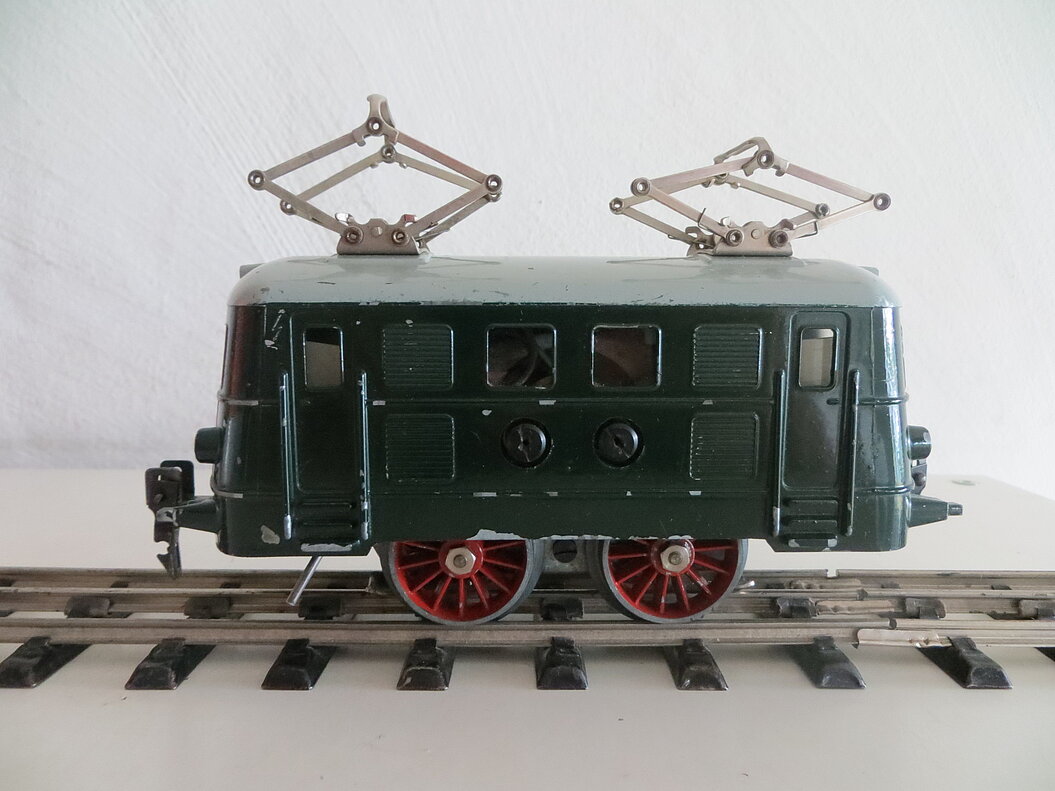 2-achsiges, dunkelgrünes Gussgehäuse, rote Speichenräder, starre Pantografen, stirnseitig erhabene Anschriften "20V" und "1946", was gleichzeitig dem Erscheinungsjahr dieser Spielzeuglokomotive entspricht, seitlich erhabene Anschrift "HAG Switzerland"