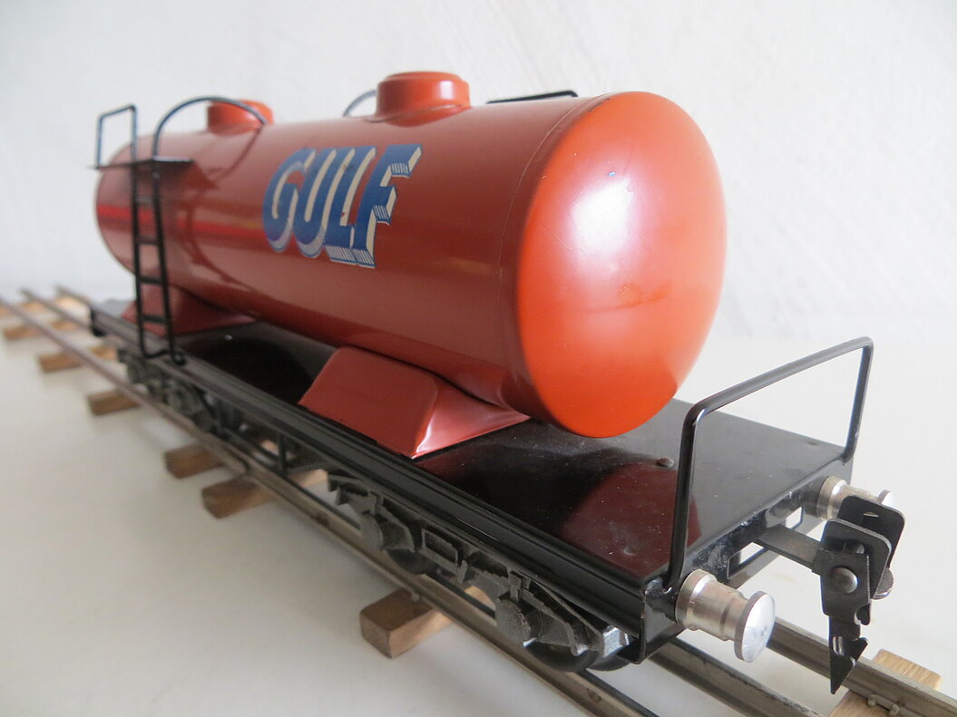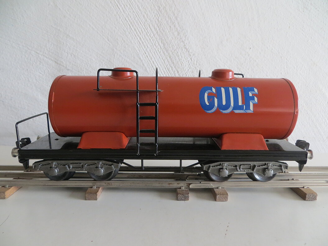 4-achsiges Blechmodell, schwarzer Rahmen mit orangefarbenem Tank, beidseitig je 1 Aufstiegsleiter, Decal-Anschriften “GULF”, Bremserbühne mit Geländer, HAG-Drehgestelle Typ 2 (ohne stilisierte Federpakete), Alupuffer, LüP. 24 cm