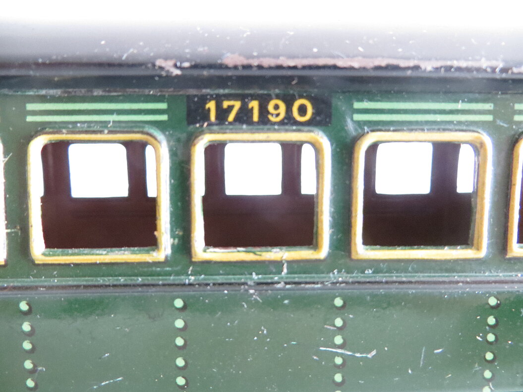 2-achsiges blaugrünes Blechmodell, lithographiertes Blech, schwarzes Dach mit 3 stilisierten Lüftern zum Abnehmen, keine Puffer, keine Türen zum Öffnen, keine Fenstercellons, Länge 13 cm