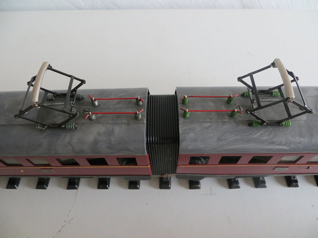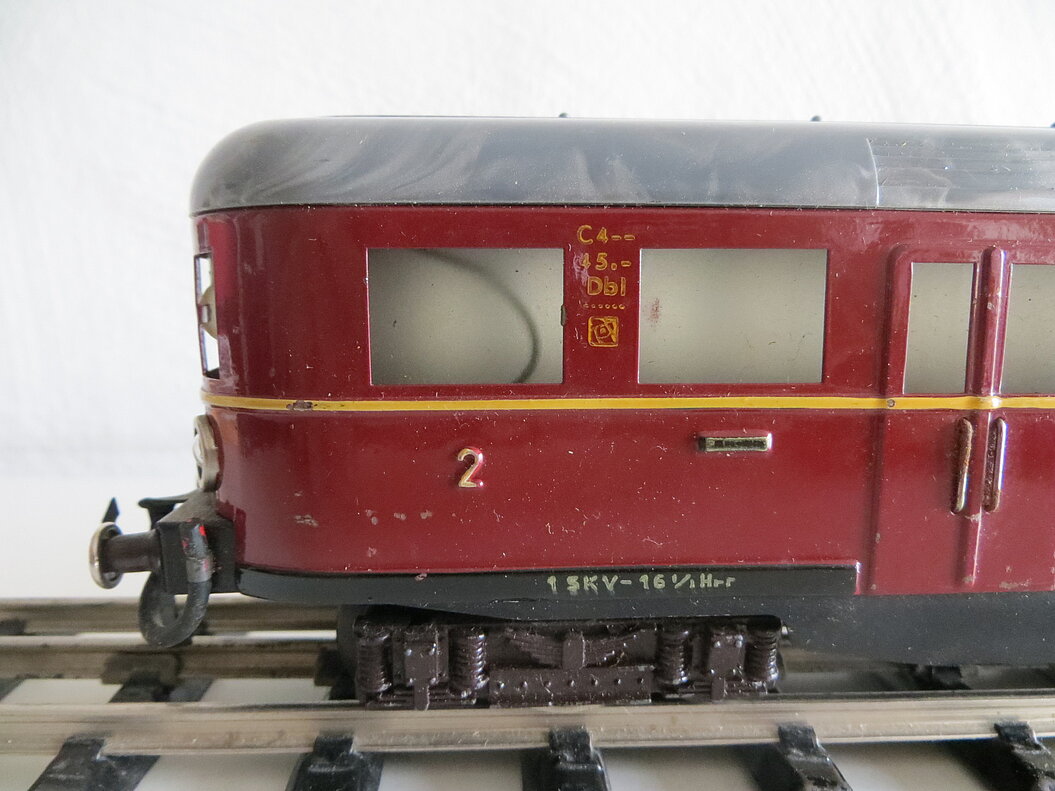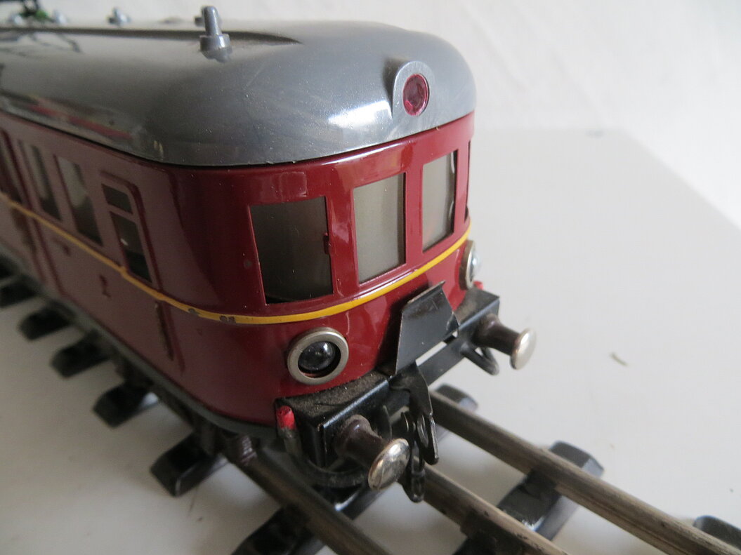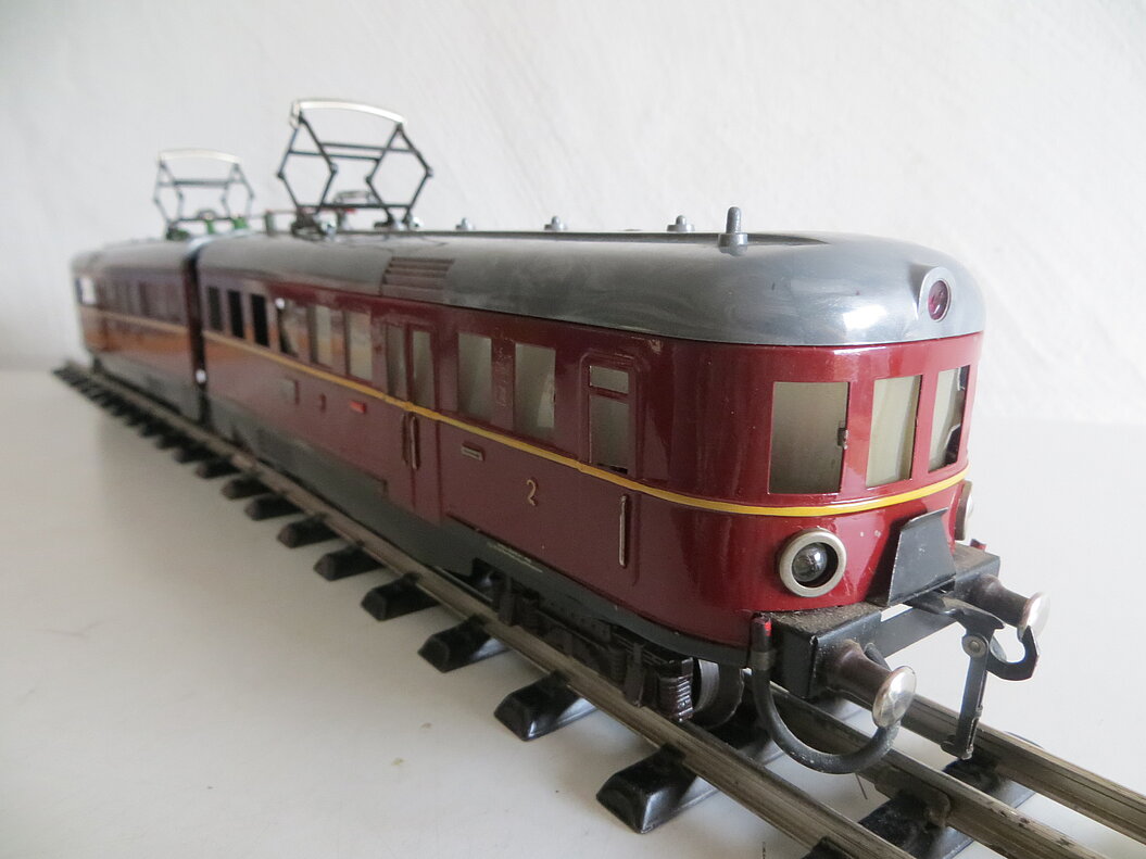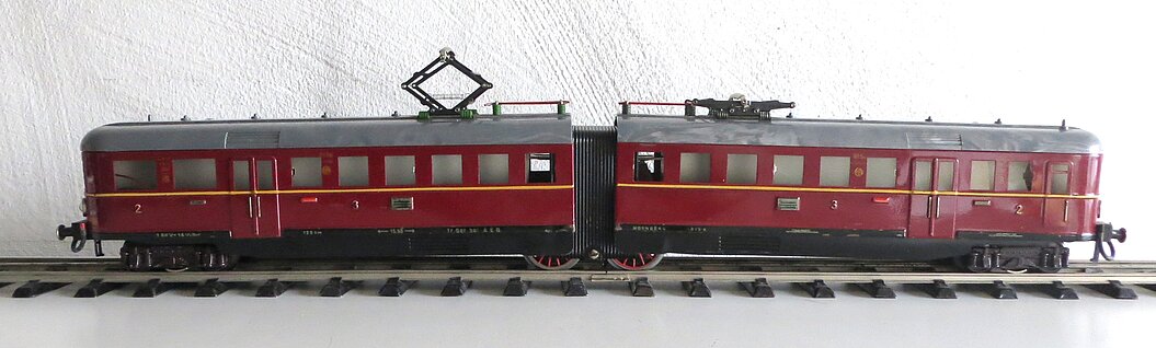2-teiliger, roter Elektro-Triebwagen 2./3. Klasse mit Fernschaltung, rotes Blechgehäuse mit gelbem Streifen und schwarzer Schürze, graues Kunststoff-Dach mit 2 beweglichen Pantos, roten Dachleitungen und grünen Isolatoren, 2 Achsen mit roten Rädern im Mittelteil angetrieben, braune Gussdrehgestelle mit braunen Bakelit-Rädern, Stirnbeleuchtung, hochgeprägte Klassenbezeichnungen “2” und “3”, Raucher/Nichtraucher- und Zuglauf-Schilder, Fenstercellons, schwarze Übergangsbleche, Metallpuffer mit braunem Schaft, imitierte Bremsschläuche, LüP. 52 cm