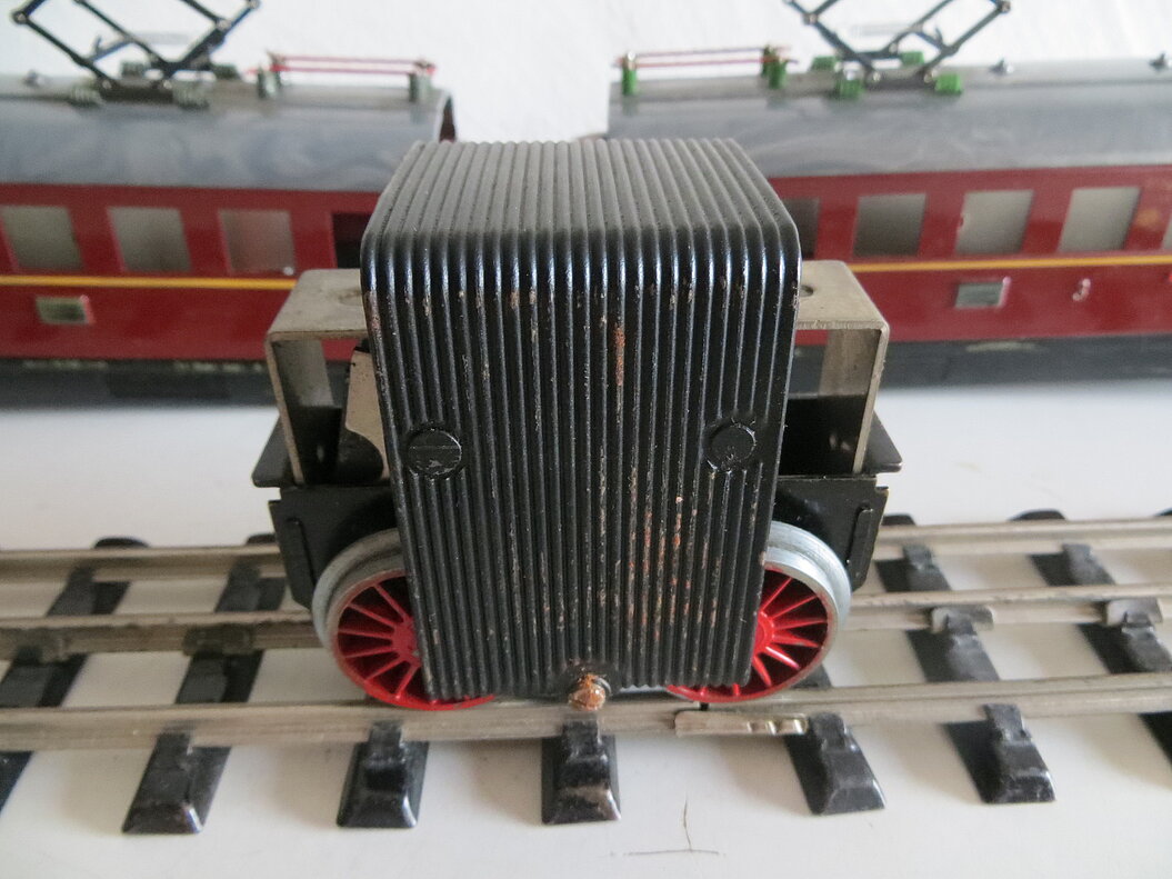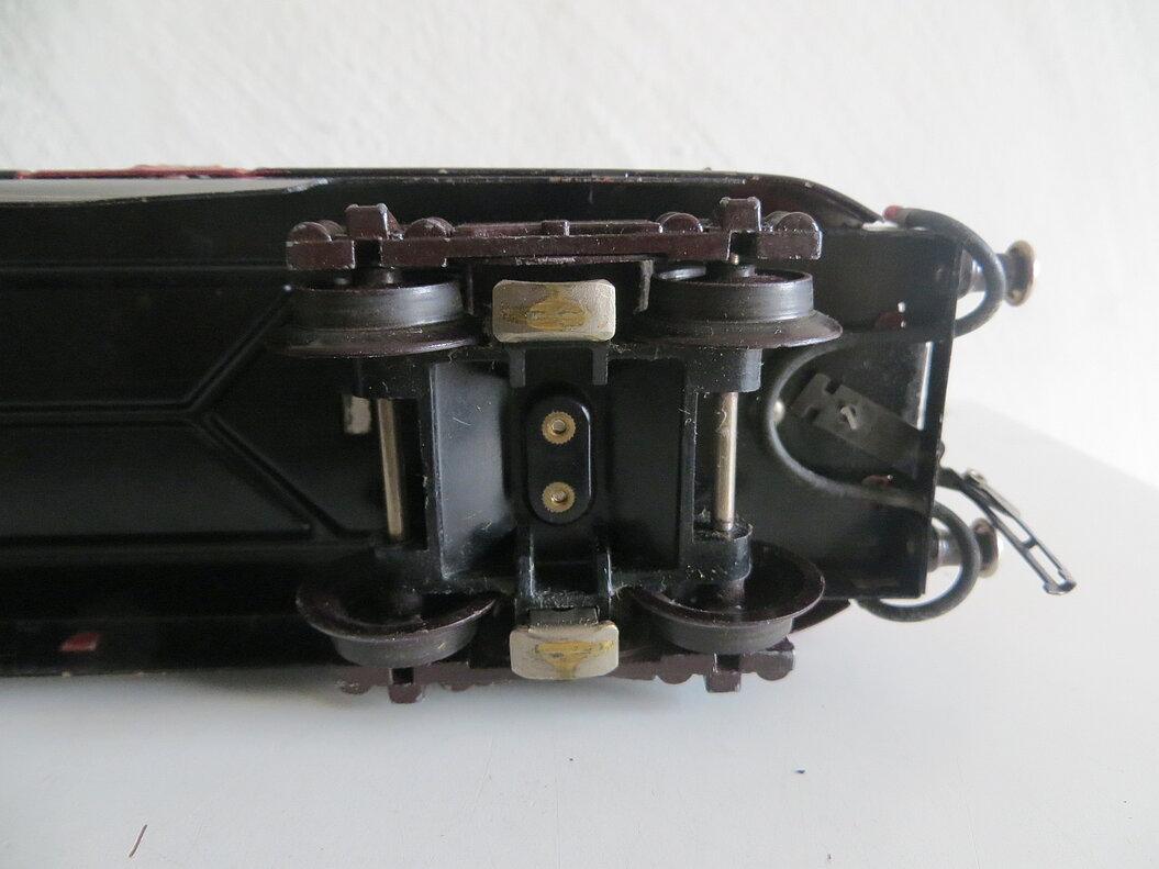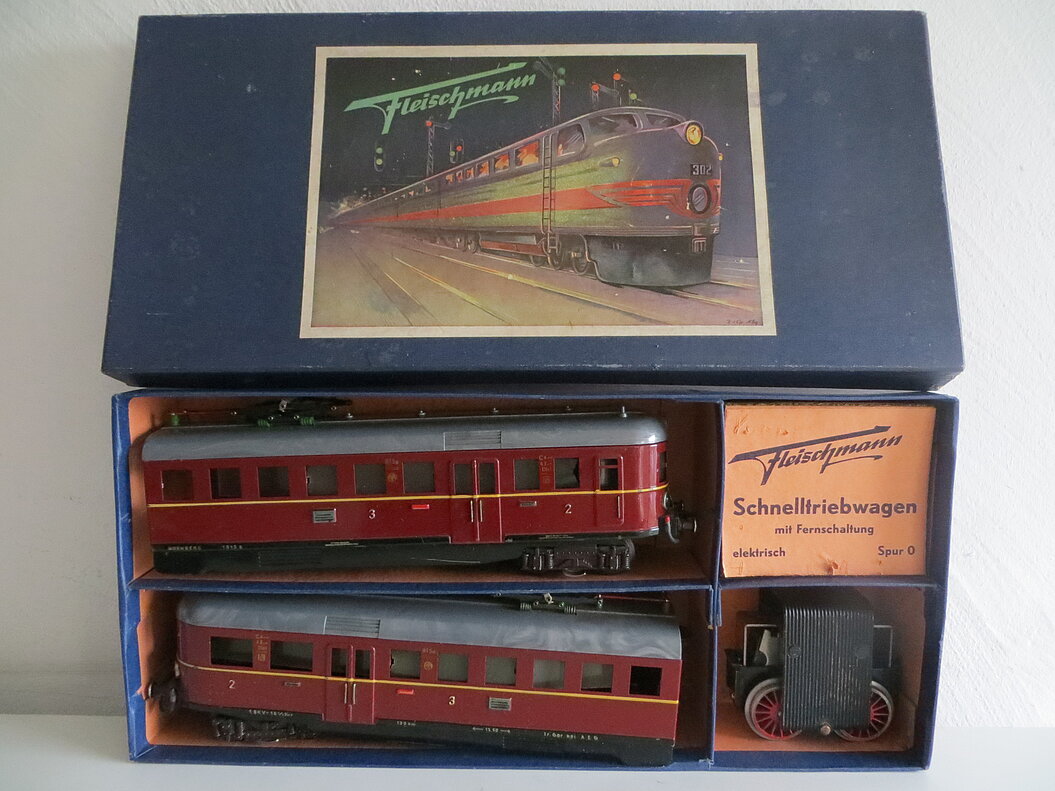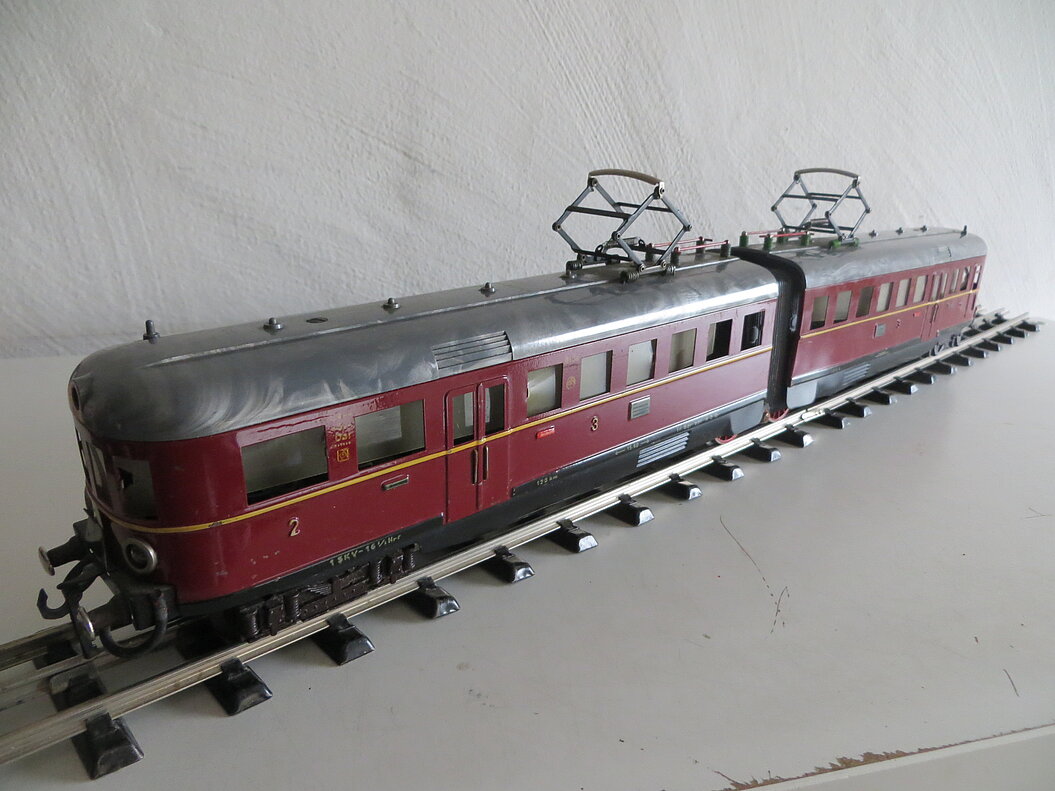 2-teiliger, roter Elektro-Triebwagen 2./3. Klasse mit Fernschaltung, rotes Blechgehäuse mit gelbem Streifen und schwarzer Schürze, graues Kunststoff-Dach mit 2 beweglichen Pantos, roten Dachleitungen und grünen Isolatoren, 2 Achsen mit roten Rädern im Mittelteil angetrieben, braune Gussdrehgestelle mit braunen Bakelit-Rädern, Stirnbeleuchtung, hochgeprägte Klassenbezeichnungen “2” und “3”, Raucher/Nichtraucher- und Zuglauf-Schilder, Fenstercellons, schwarze Übergangsbleche, Metallpuffer mit braunem Schaft, imitierte Bremsschläuche, LüP. 52 cm