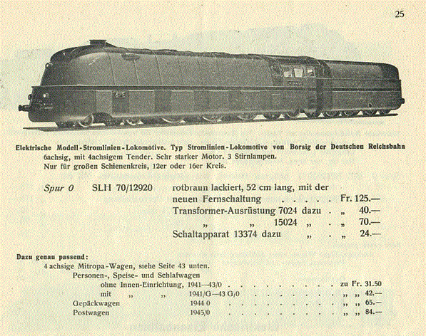 Auszug aus dem Katalog von Spielwaren O. Hoppler, Zürich, von 1936, Seite 25. Abgebildet ist natürlich das Original von Märklin.
