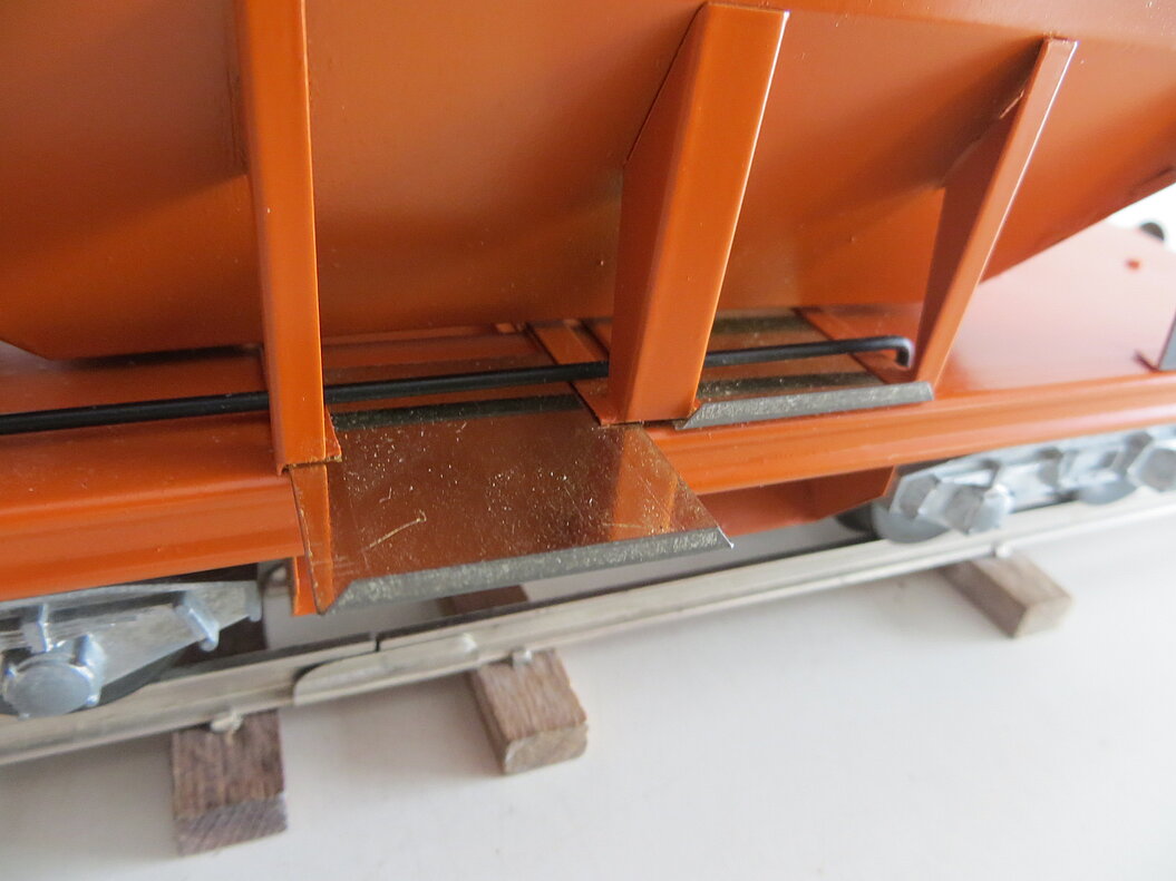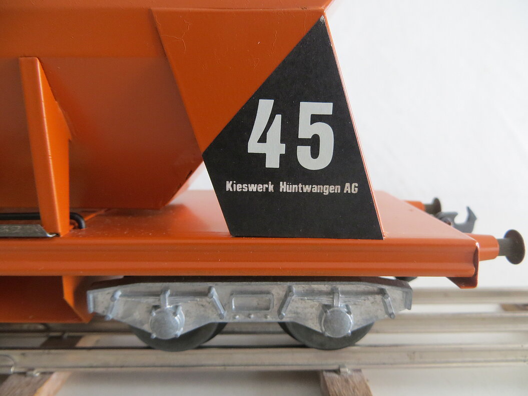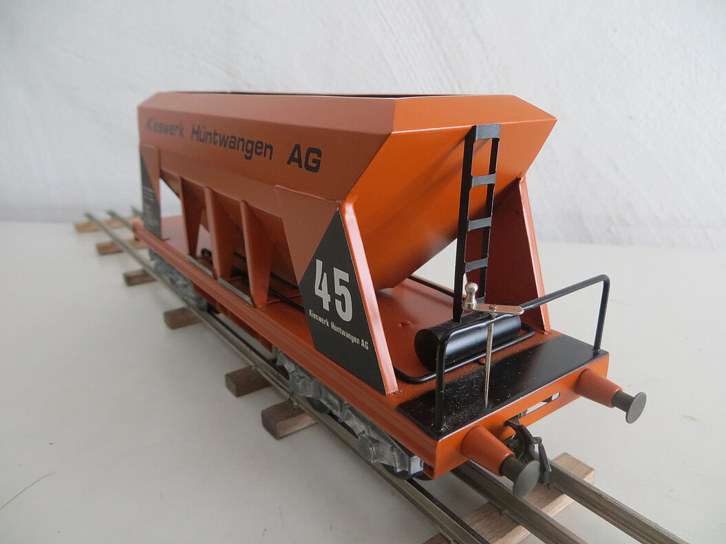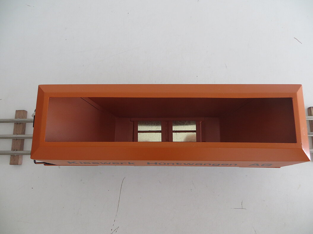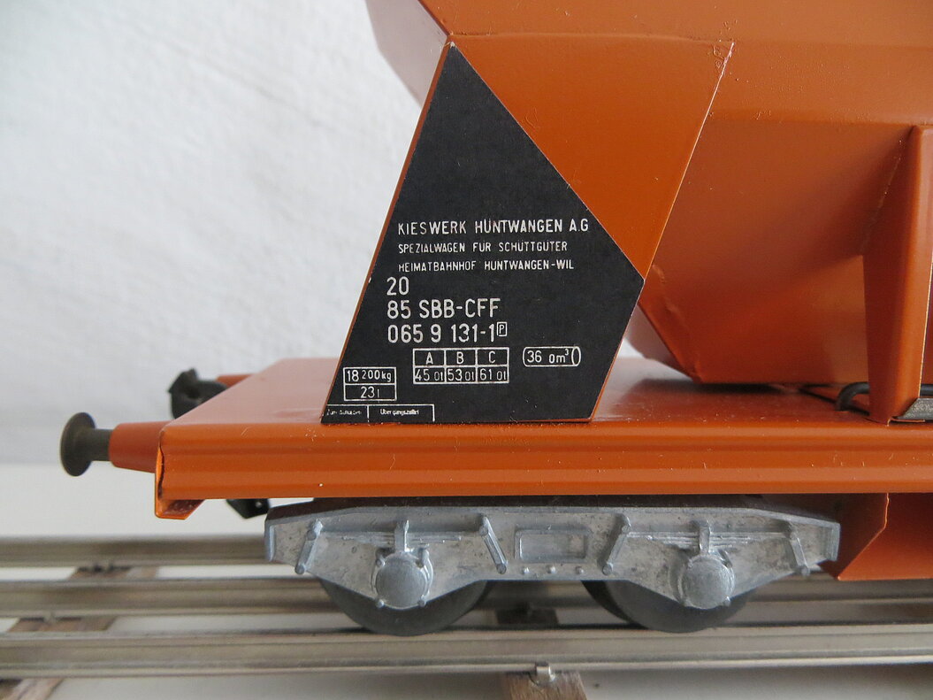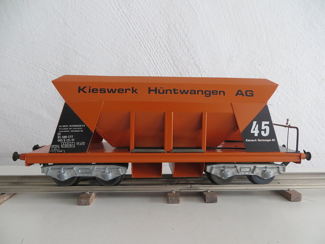 4-achsiges Modell mit Teilen aus Blech und Guss, hellbraun, Bremserplattform mit Bremsspindel, Federpuffer, Anschriftsfeld (als Kleber): Vermerke "Kieswerk Hüntwangen AG, Spezialwagen für Schüttgüter" und andere betriebliche Anschriften, gefederte Metallpuffer, 4 bewegliche Schieber, welche einen realistischen Spielbetrieb ermöglichen. Aber Hand aufs Herz: Welche/r Sammler*in macht das schon..., LüP. 25 cm