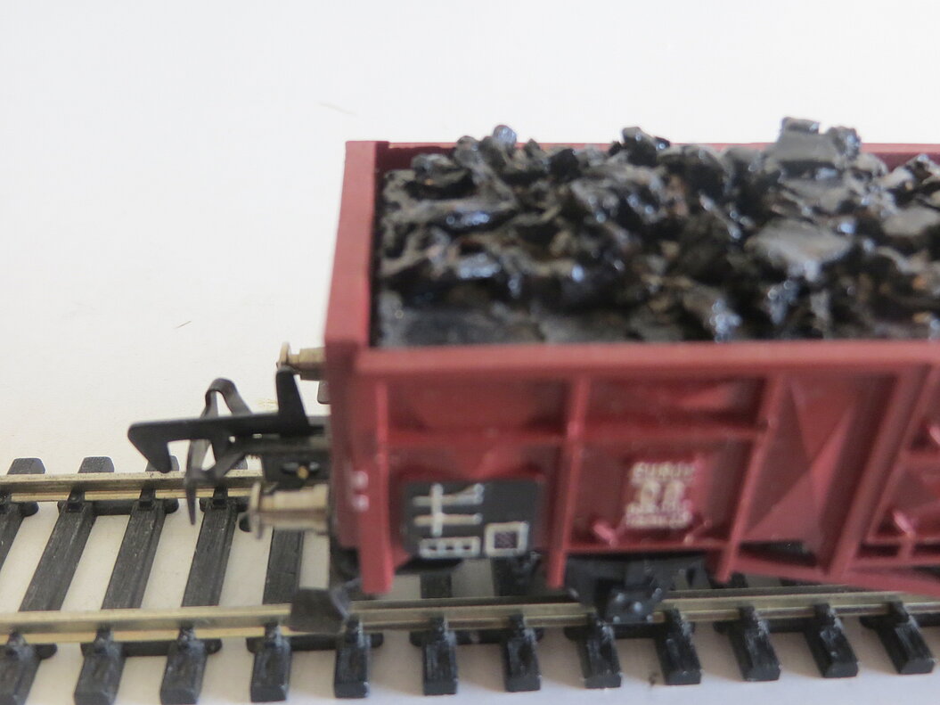 2-achsiges Kunststoff-/Gussmodell, schwarzes Fahrwerk aus Guss, brauner Aufbau mit Sprengwerk, silberfarbene Metall-Puffer, automatische FLM-Kupplung älteren Typs, vier Rangiertritte, schwarze Kohleladung (herausnehmbar), Scheibenräder, LüP. 117 mm