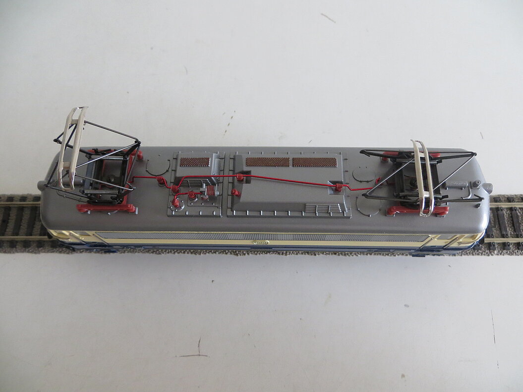 Besonderheiten der Rheingold-Lok: Gehäuse und Fahrwerk aus Guss, silberfarbene Lüfter über die ganze Länge, sog. “Bügelfalte”, bewegliche Pufferbohle, Trennkante zwischen blau und crème unscharf ausgeführt (wohl schabloniert), schwarze Lokschilder mit Betriebsnummer E 10 1311, erhaben ausgeführte Anschriften, rote Dachleitungen, schwarzer Blech-Panto mit braunen Isolatoren, umschaltbar von Unter- auf Oberleitung.