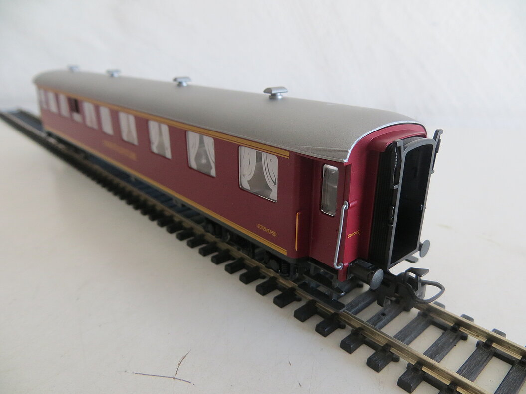 Der 4-achsige rote Speisewagen mit den gelben Streifen und dem grauen Dach basiert auf dem Grundmodell des schweren Stahlwagens von Fleischmann (Katalog-Nr. 5939). Er verfügt über Normschächte.