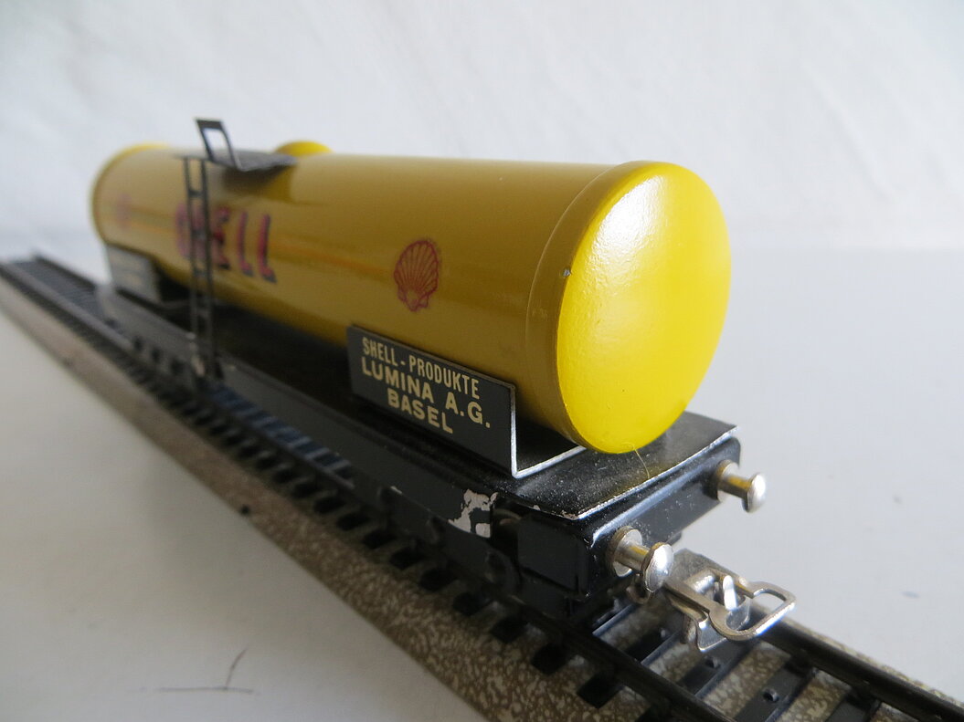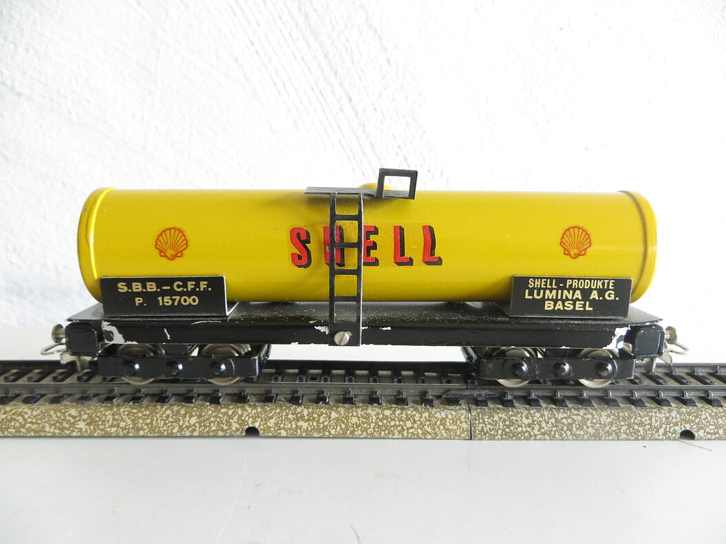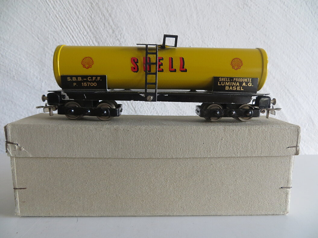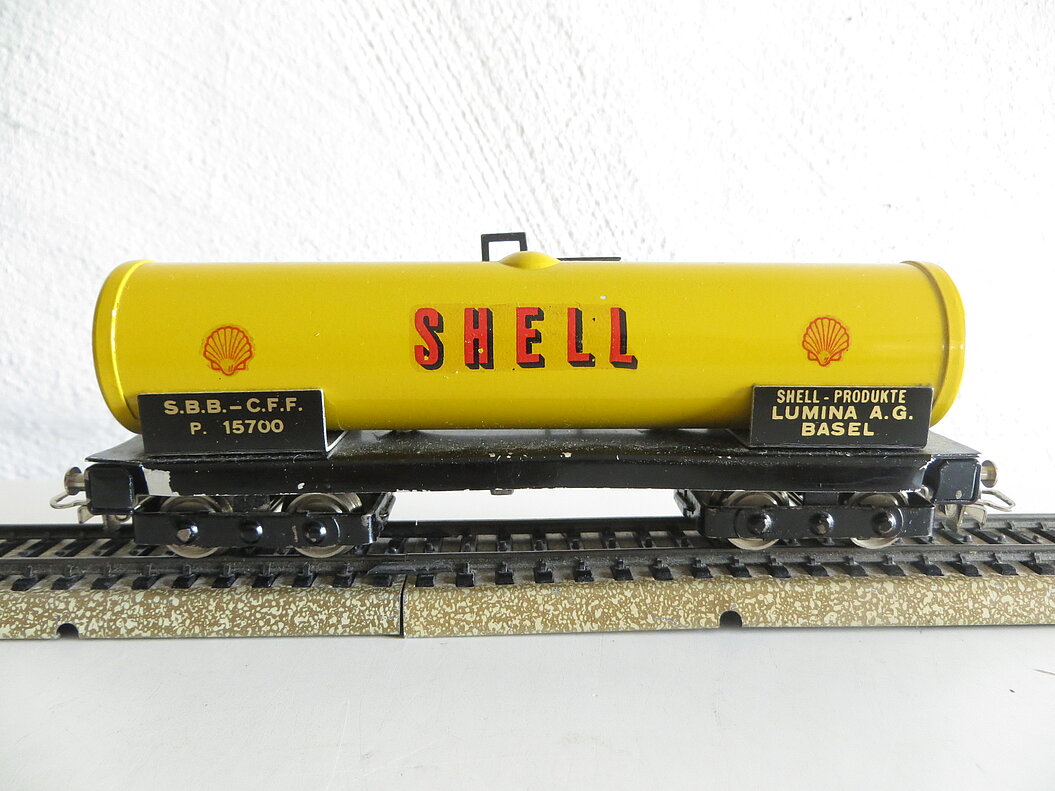 4-achsiges Blech-/Holzmodell, schwarzer Blechrahmen, schwarze Drehgestelle mit beweglichen Pufferbohlen, silberfarbene "dicke" Puffer und Kupplungen, gelber Holzkessel mit schwarzer Stempelung "SHELL" beidseitig links und rechts, gedrehter Messingknopf als Fülldeckel, schwarz eloxierte Anschrifttafeln "S.B.B.-C.F.F. P. 15700" (rechts) bzw. "Shell-Produkte LUMINA A.G. Basel" (links), LüP. 165 mm