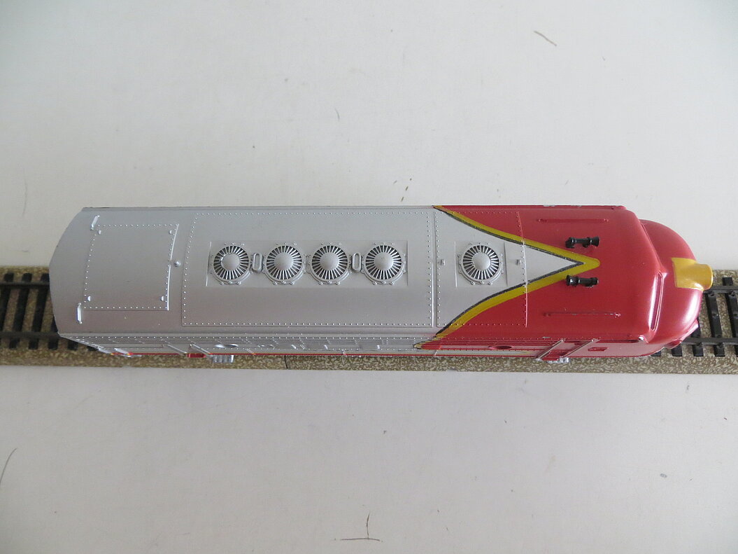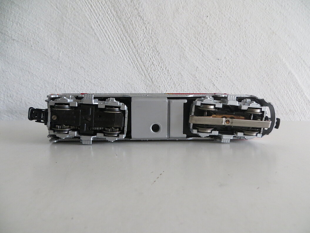 Gussgehäuse rot/silber, silberfarbenes Dach, silberfarbene Kunststoff-Drehgestelle, vorne 2 mittige Stirnlampen, Fenster/Bullaugen mit hinterlegten Cellons, ohne Handschalthebel, mit Märklin-Signet, lediglich Kupplungshaken, LüP. 175 mm