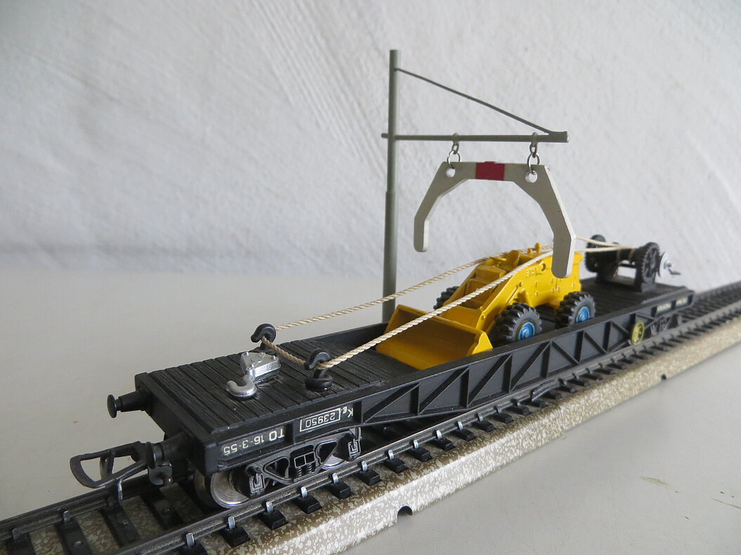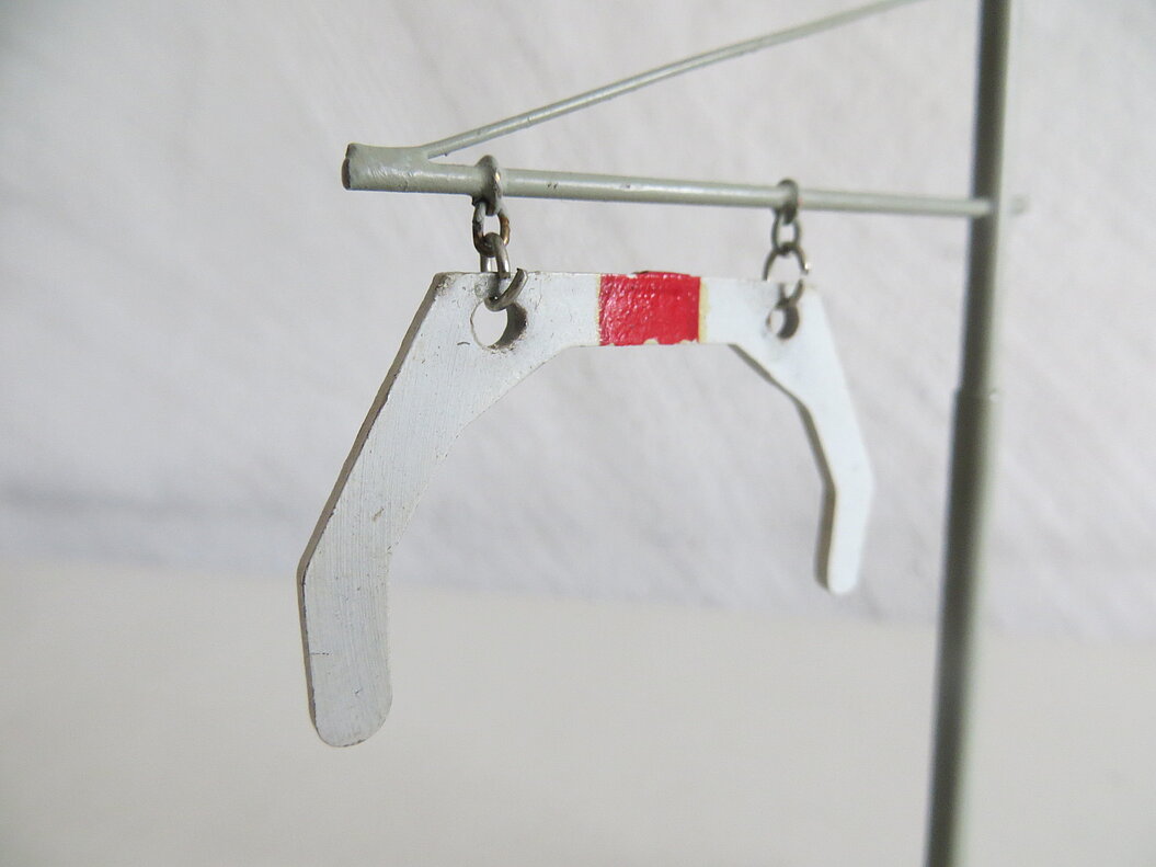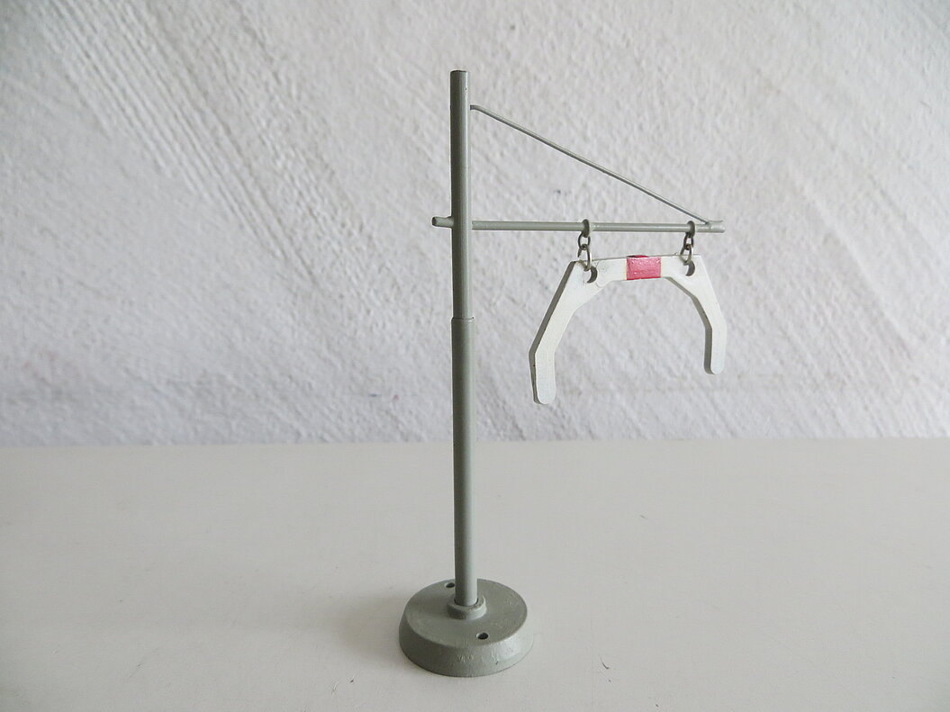 Graue Metall-Ausführung mit rundem Guss-Sockel (Durchmesser 25 mm mit zwei Befestigungsbohrungen), 100 mm hoch, Ausleger total 60 mm lang, weisses Lademass mit rotem Balken aus Kunststoff