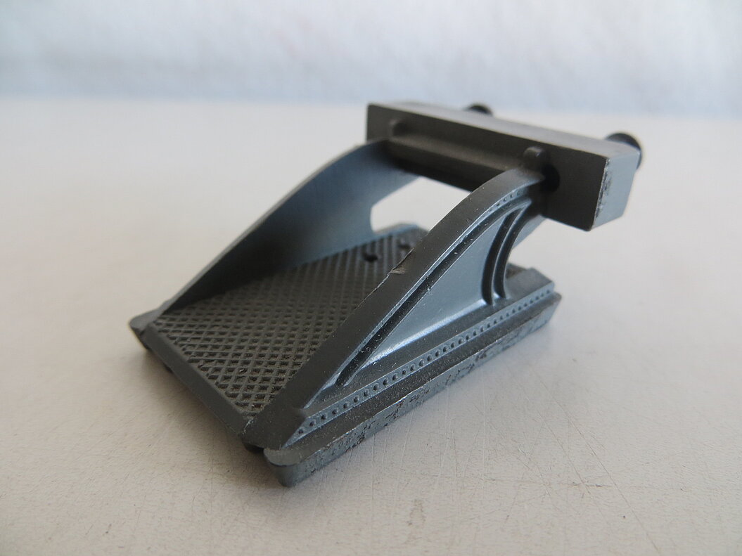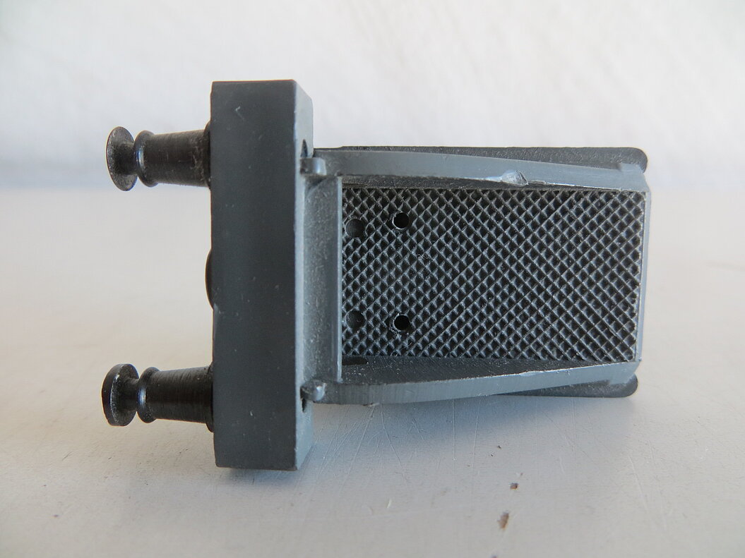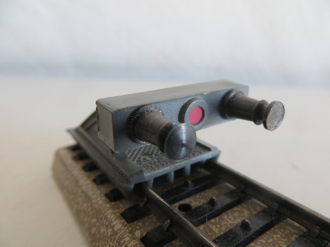 Graue Kunststoff-Ausführung mit Puffern aus Metall, imitiertes rotes Licht zwischen den Puffern, Länge ca. 50 mm, für Gleich- und Wechselstrom-Geleise nutzbar