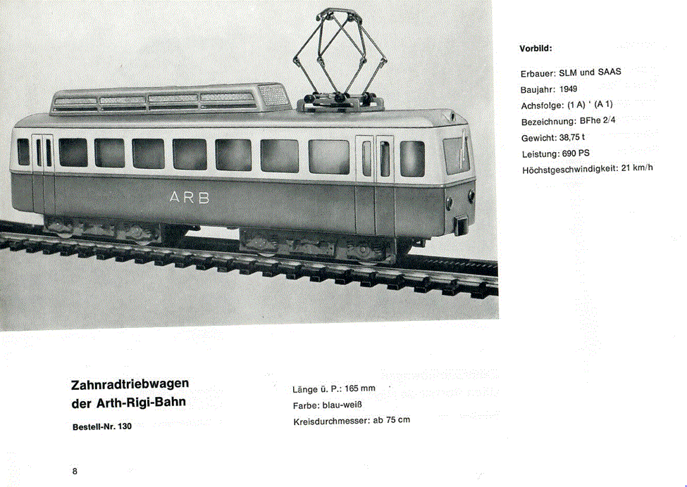 Auszug aus dem undatierten Heinzl-Katalog mit dem Zahnradtriebwagen der Arth-Rigi-Bahn, Seite 8
