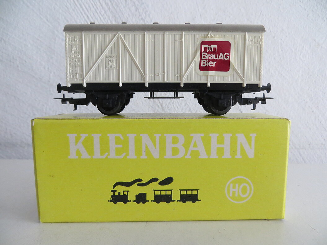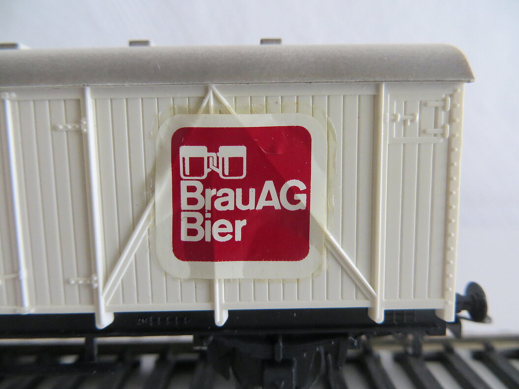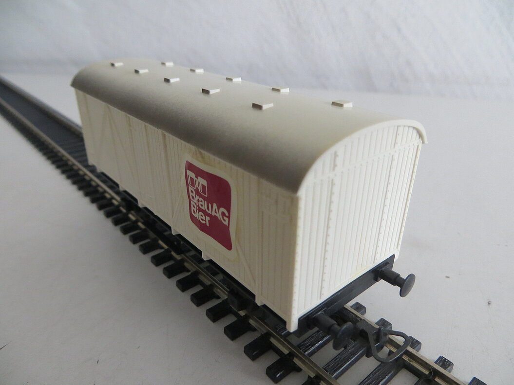 2-achsiges Kunststoff-Modell, schwarzes Wagenchassis aus Kunststoff mit Aufstiegsleitern mittig, weisser Aufbau mit dunkelrotem Decal/Logo “Brau AG Bier”, verwittertes Runddach mit 10 angedeuteten Lüftern, beweglich gelagerte Achsen, LüP. 110 mm