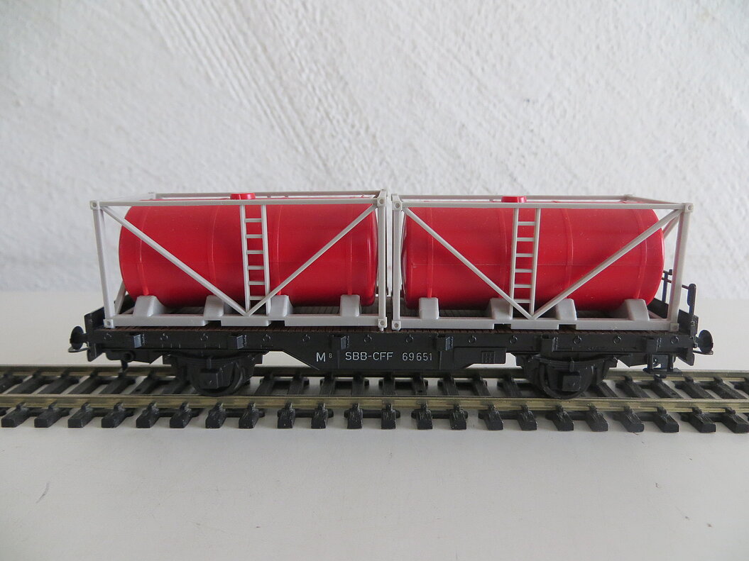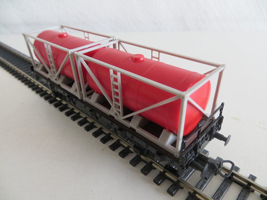 2-achsiges Kunststoffmodell, schwarzes Wagenchassis mit brauner Ladefläche, Ladung: 2 rote und runde Getränke-Container in hellgrauem Container-Rahmen, beweglich gelagerte Achsen, LüP. 131 mm