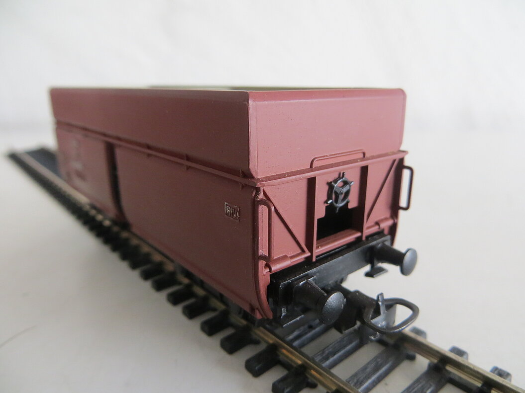 4-achsiges Kunststoff-Modell, schwarzes Wagenchassis aus Guss, grauer Aufbau aus Kunststoff, Innenwand crèmefarben, erhabene Anschriften weiss abgesetzt, schwarzes Rad je stirnseitig, schwarze Drehgestelle, LüP. 120 mm