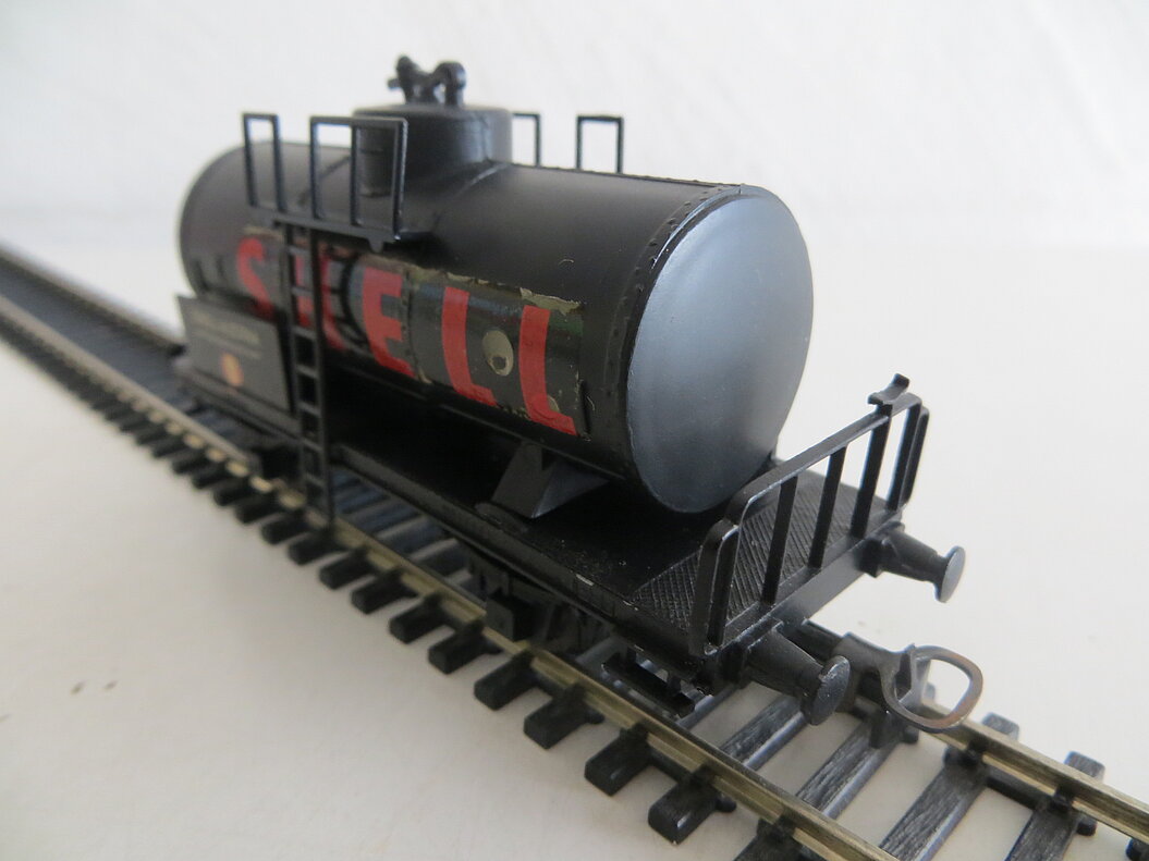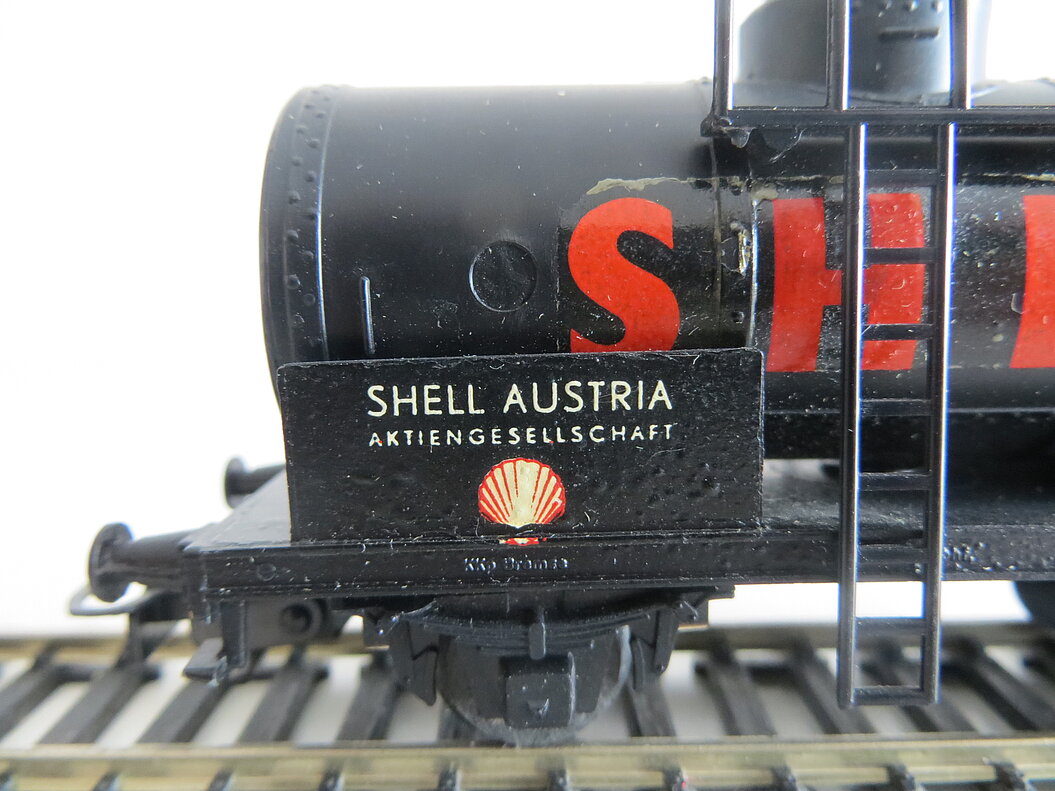 2-achsiges Kunststoff-Modell, schwarzes Wagenchassis mit Bremserbühne aus gestanztem Blech, schwarzer Kessel aus Kunststoff, Anschrift "SHELL" in rot als Decal, Anschriftstafel mit unterschiedlichen Beschriftungen ("SHELL AUSTRIA Aktiengesellschaft" bzw. "Wien I Schubertring"), schwarze Leitern und Galerie aus Kunststoff, beweglich gelagerte Achsen, LüP. 103 mm