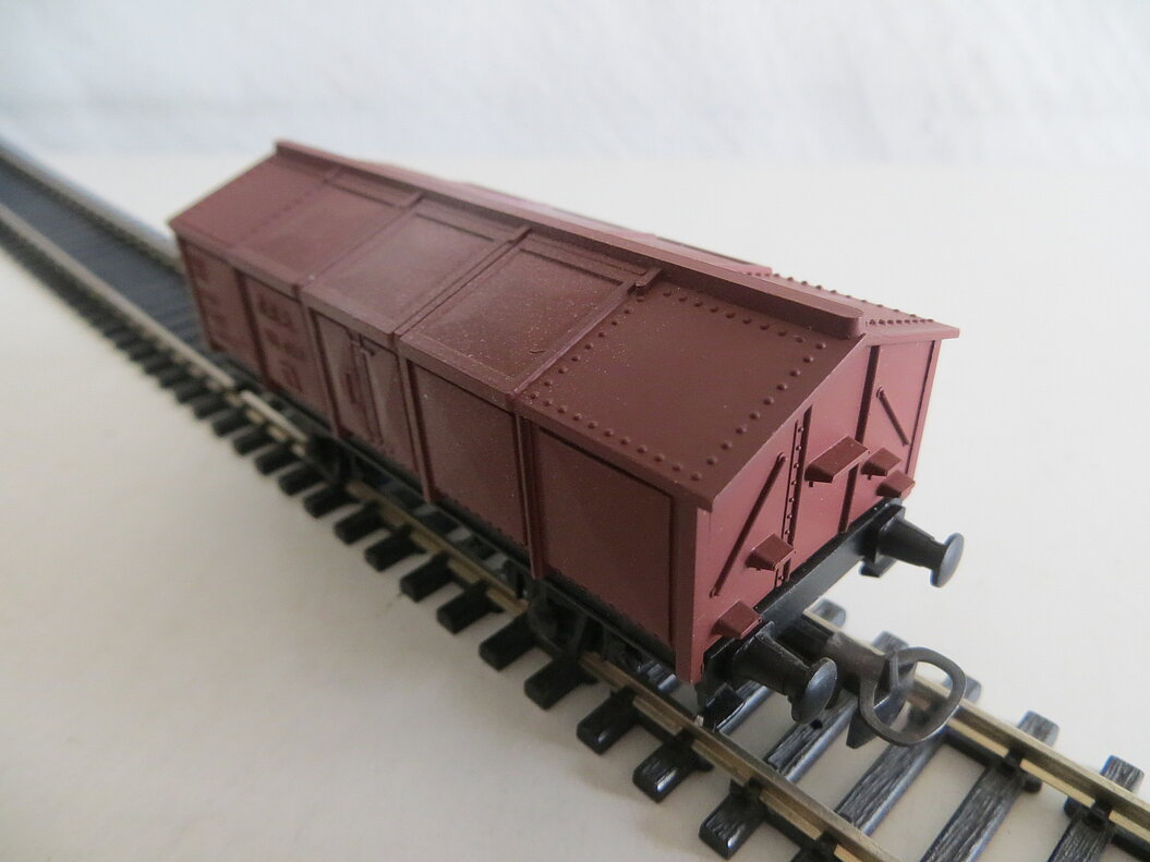 2-achsiges Kunststoff-Modell, schwarzes Wagenchassis mit Rangiertritten, brauner Aufbau, Klappdeckel nicht zum Öffnen, beweglich gelagerte Achsen, LüP. 93 mm