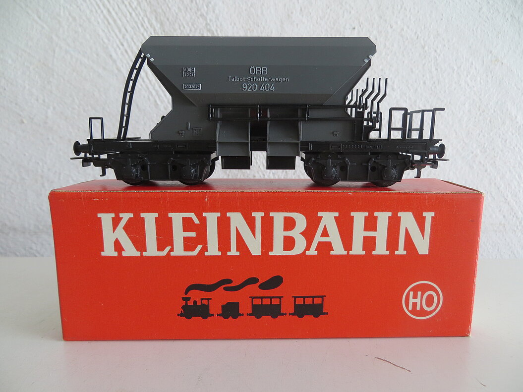 4-achsiges Kunststoff-Modell, schwarzes Wagenchassis mit Bremserbühne und verschiedenen Armaturen aus Kunststoff, grauer Trichter-Aufbau aus Kunststoff, Innenwand rot, Anschrift "ÖBB Talbot-Schotterwagen" erhaben und weiss abgesetzt, schwarze Leiter einseitig aus Kunststoff, schwarze Drehgestelle, LüP. 125 mm