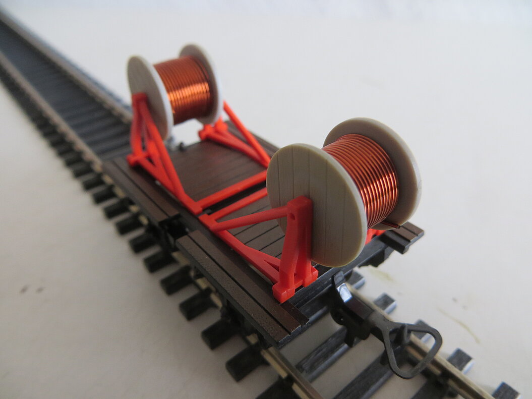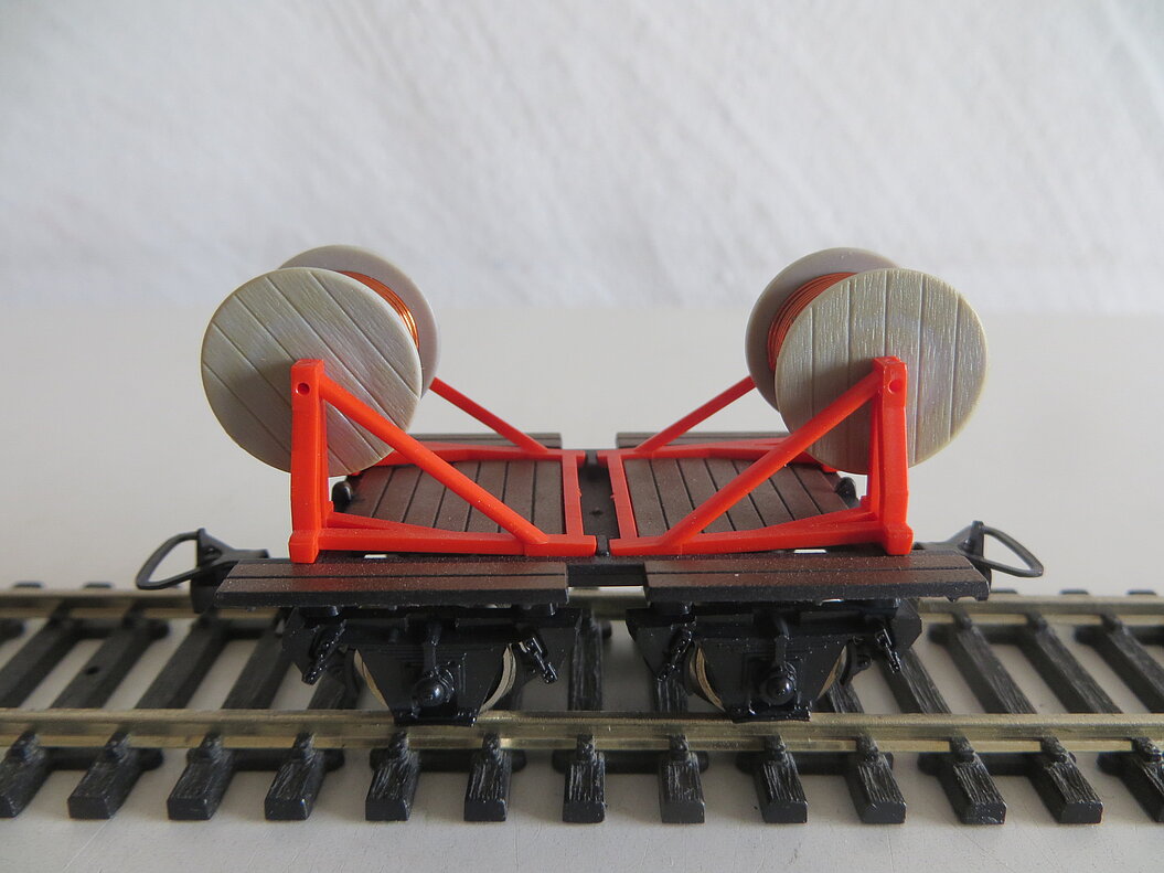2-achsiges Kunststoff-Modell, schwarzes Wagenchassis mit brauner “Holz”-Auflage, orangefarbene Rahmen mit zwei Kabelrollen mit Kupferdraht, unbeweglich gelagerte Achsen, keine Puffer, Länge 53 mm