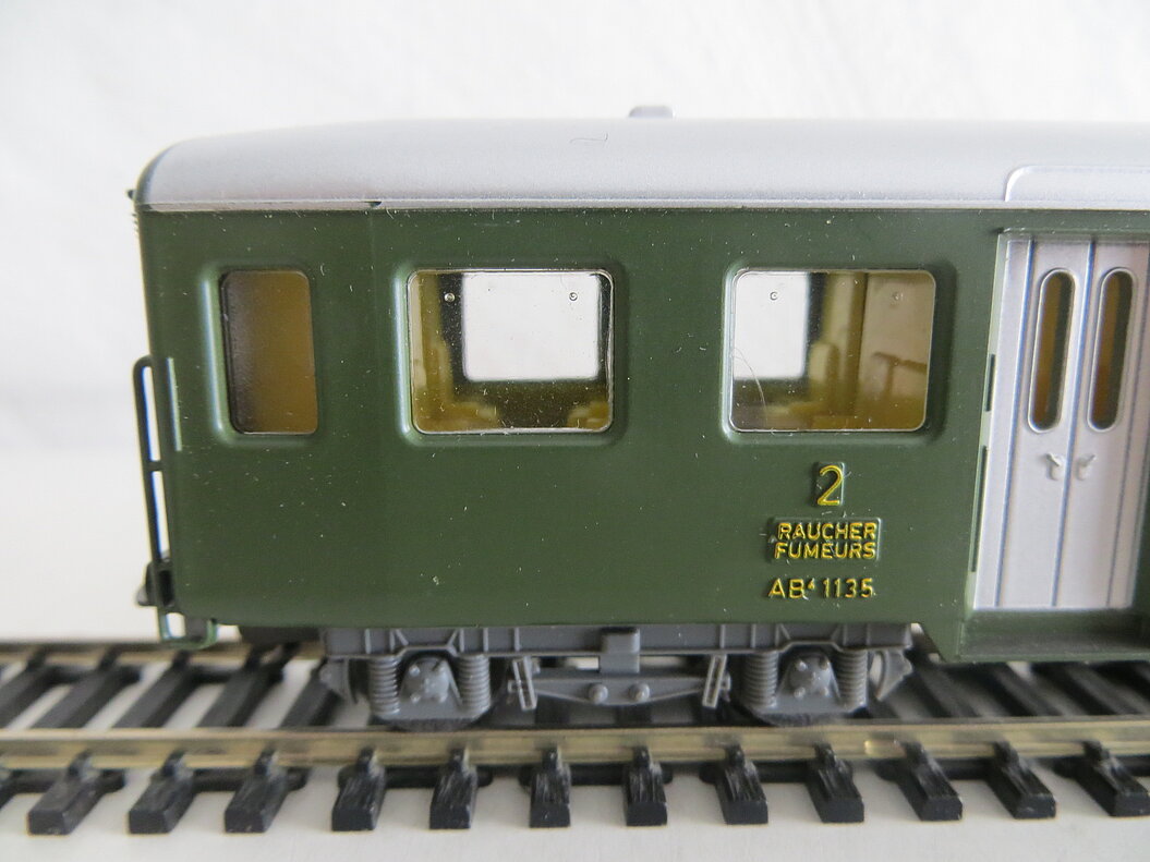 4-achsiger Kunststoffwagen 1./2. Klasse, schwarzes Wagenchassis aus Kunststoff, grüner Aufbau, silberfarbenes Dach mit sechs angedeuteten Lüftern, silberfarbene Türen (Seiteneinstieg), hellgraue Kunststoff-Drehgestelle und Bodenarmaturen, Kunststoff-Fenster, rote Inneneinrichtung, erhabene Anschriften, Betriebsnummer und "SBB-CFF", angegossene grüne und diffizile Handläufe, LüP. 224 mm