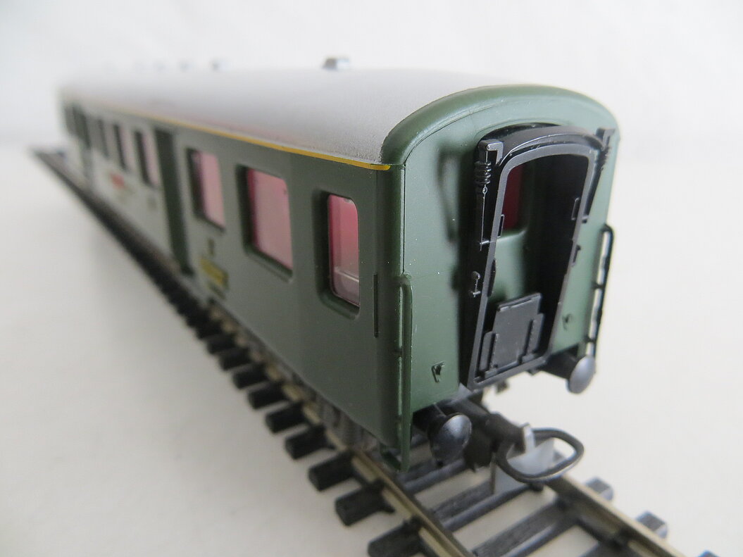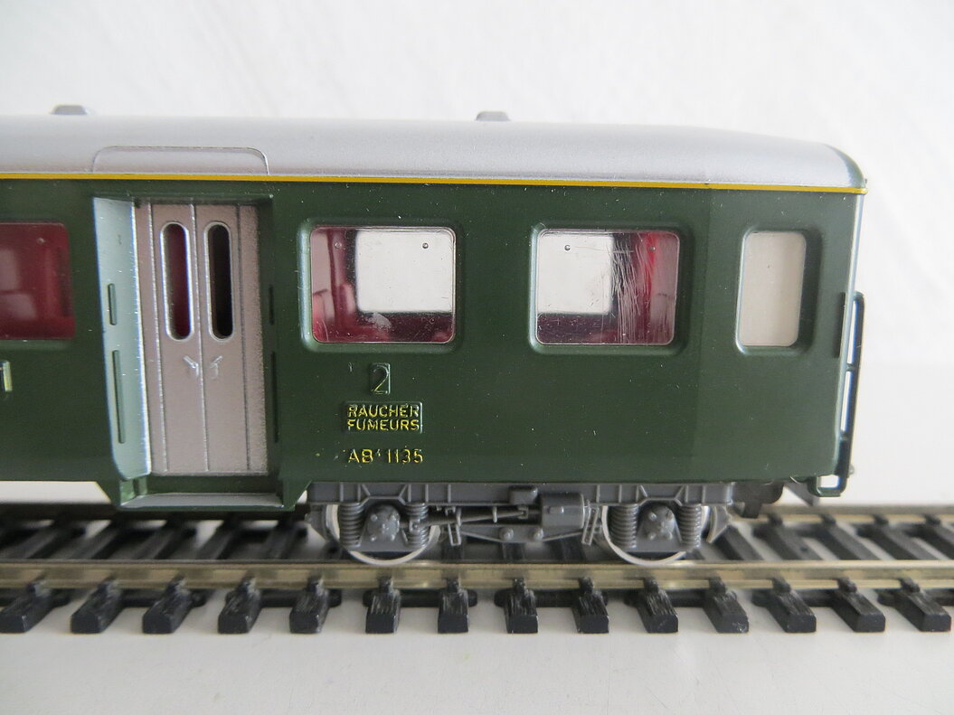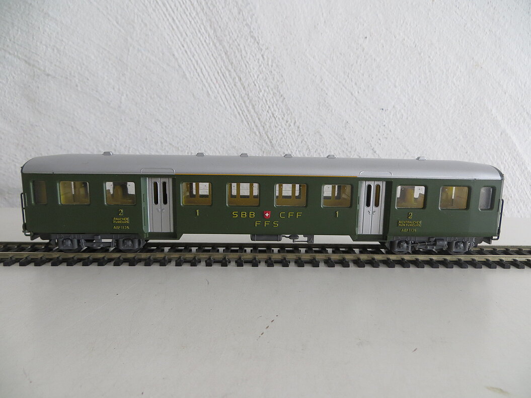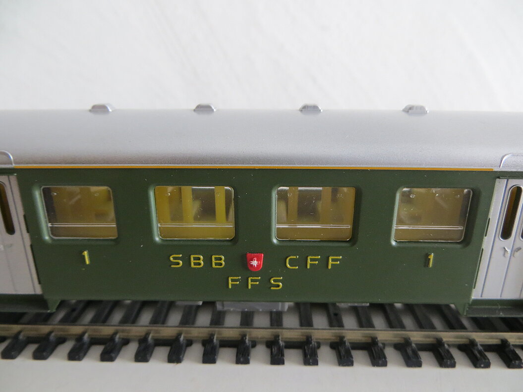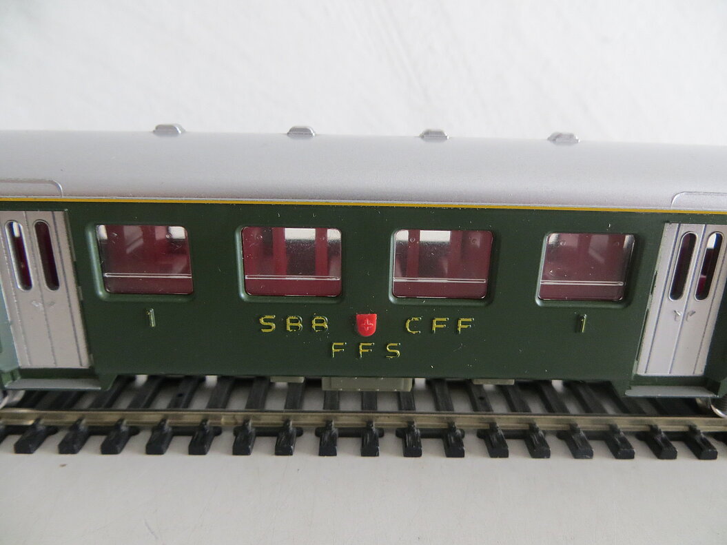 4-achsiger Kunststoffwagen 1./2. Klasse, schwarzes Wagenchassis aus Kunststoff, grüner Aufbau, silberfarbenes Dach mit sechs angedeuteten Lüftern, silberfarbene Türen (Seiteneinstieg), hellgraue Kunststoff-Drehgestelle und Bodenarmaturen, Kunststoff-Fenster, gelbe Inneneinrichtung, erhabene Anschriften, Betriebsnummer und "SBB-CFF", angegossene grüne und diffizile Handläufe, LüP. 224 mm
