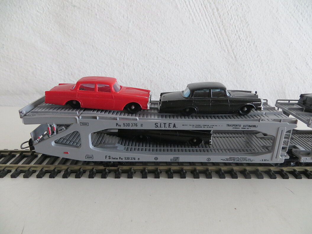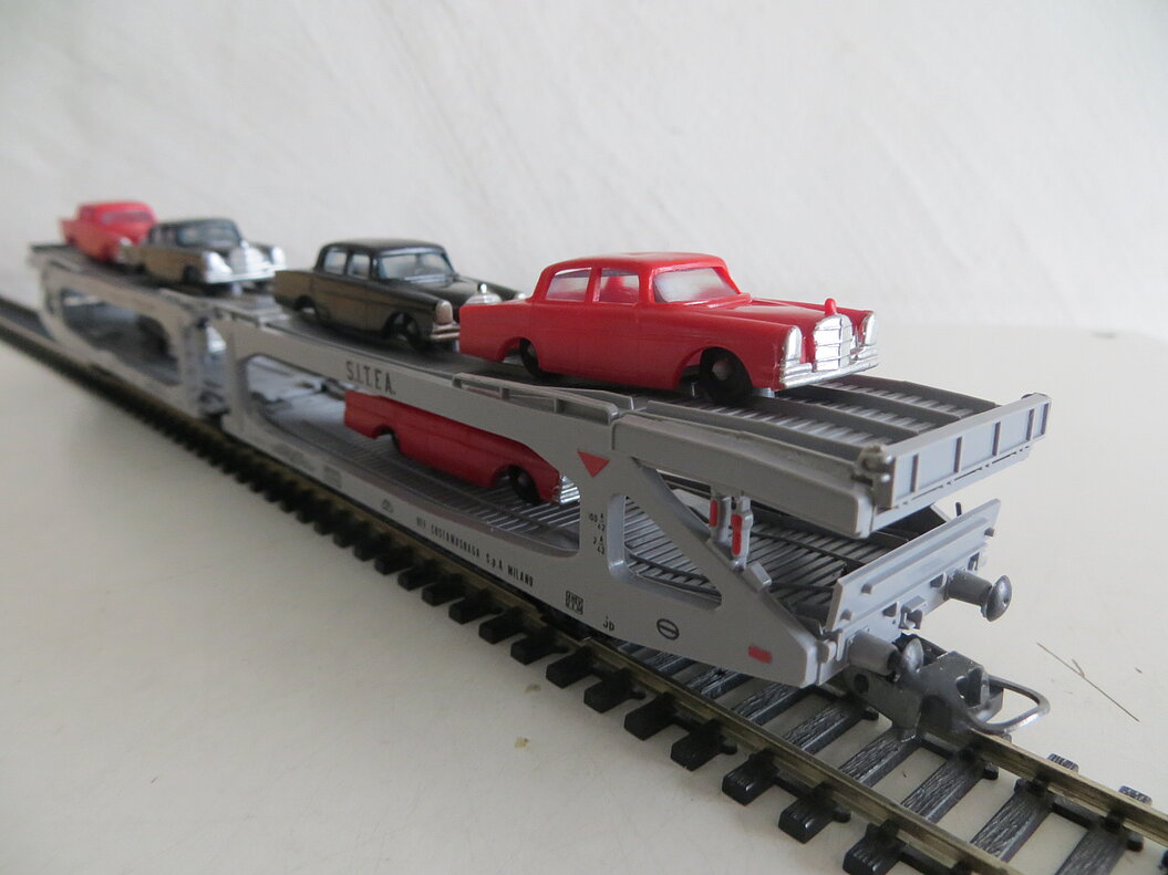 Der Autotransportwagen ist mit sechs Autos beladen. Die schwarzen und roten Mercedes-Automodelle wurden von Lima selber produziert.