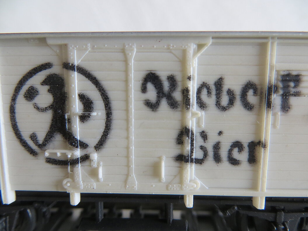 2-achsiges Kunststoff-Modell, rohweiss, schwarzes Chassis, dunkelgraues Dach, erhabene Anschriften, schablonierte schwarze Anschrift der Brauerei RIEBECK (mit Logo), kein NEM-Kupplungsschacht, Kupplungen und Achsen aus Metall, Lampenhalter, LüP. 104 mm