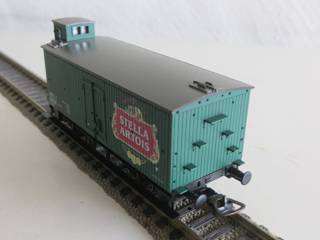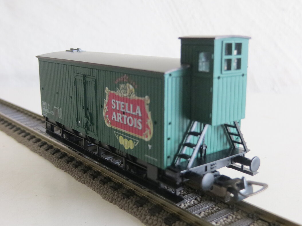 2-achsiges Kunststoffmodell, schwarzer Rahmen, dunkelgrüner Aufbau mit hochstehendem Bremserhaus und silbergrauem Dach, “STELLA ARTOIS”-Logo, schwarze Leitern, Normschacht, LüP. 100 mm