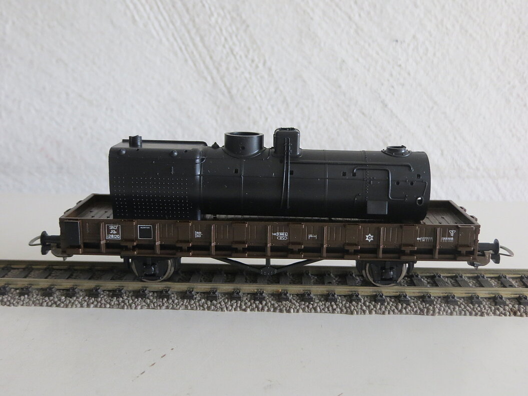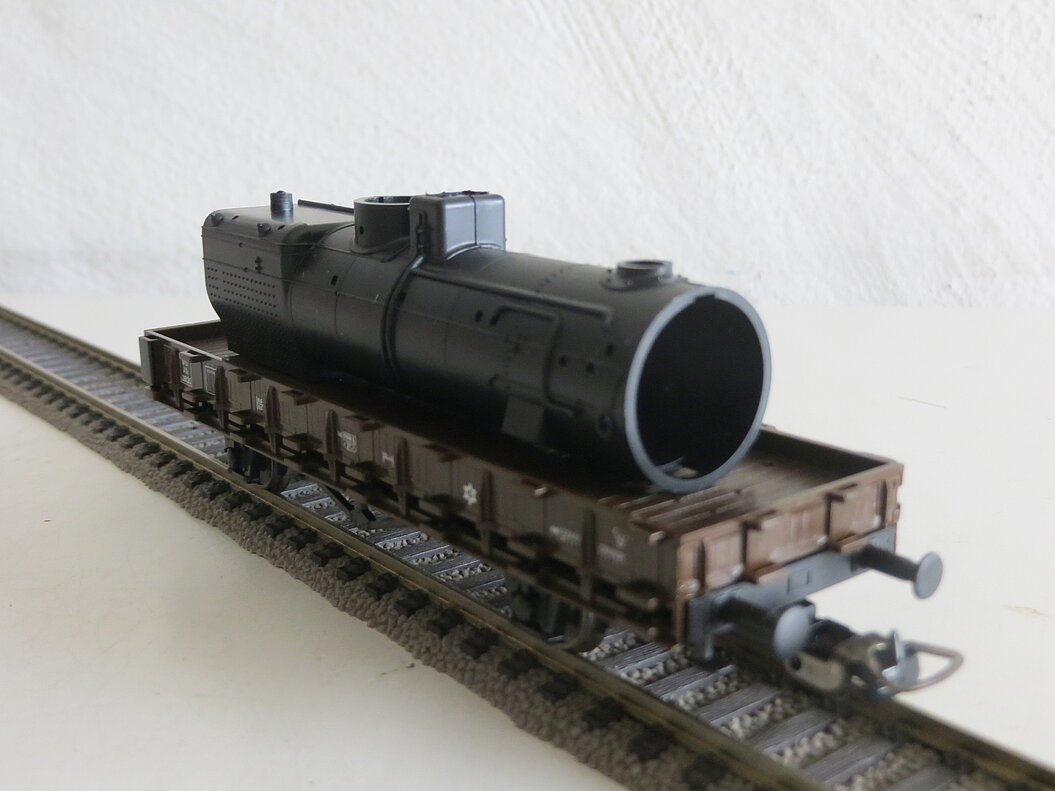 Flachwagen der SNCF mit Dampflokkessel als Beladung von Piko