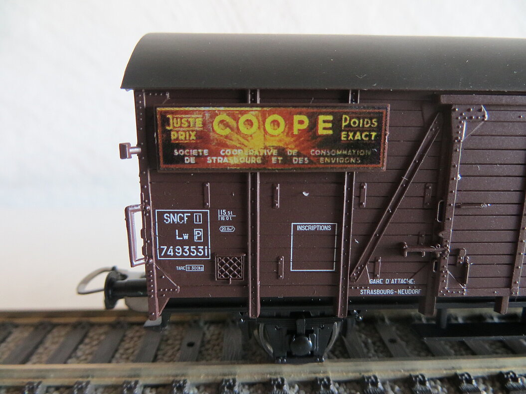 2-achsiges Kunststoffmodell, schwarzer Rahmen, dunkelbrauner Aufbau mit schwarzem Dach, geklebtes Schild “Coopé - Juste Prix - Poids exact - Société Coopérative de Consommation de Strasbourg et des Environs”, Normschacht, LüP. 104 mm