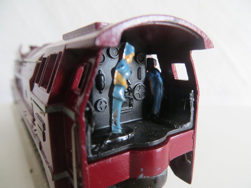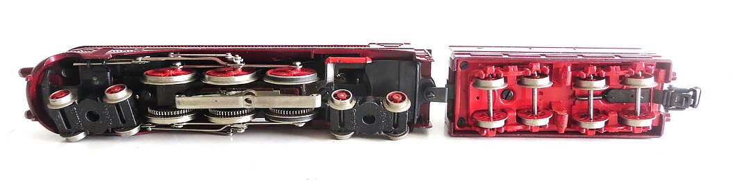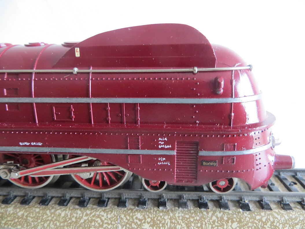 Gussmodell, rot lackiertes Gehäuse mit silbernen Längsstreifen, verschlossenes Bürstenlager, Anschriften als Decals in weisser Schrift oder als Ätzteile, umlaufende Galeriestange, Figuren des Lokführers und des Heizers, 4-achsiger Tender, LüP. 285 mm