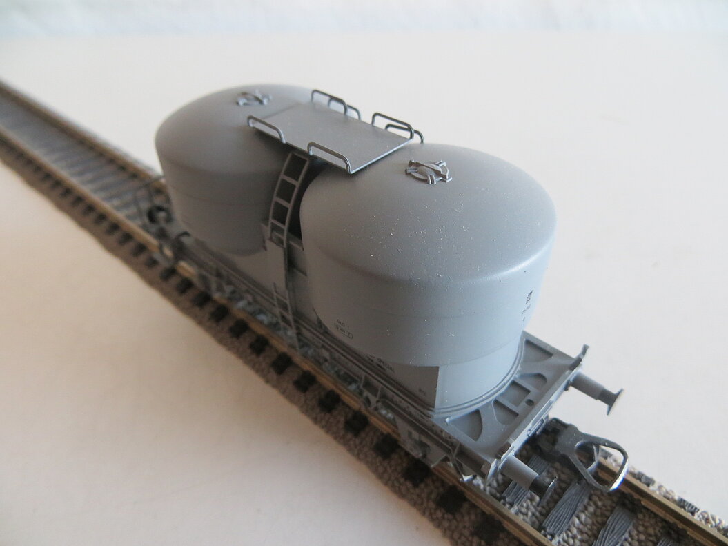 2-achsiges Kunststoffmodell, grau, schwarze Anschriften, Normschächte, Bremserplattform einseitig, graue Leitern und Galerie, LüP. 98 mm