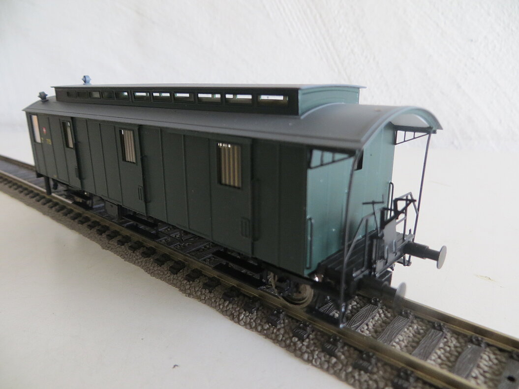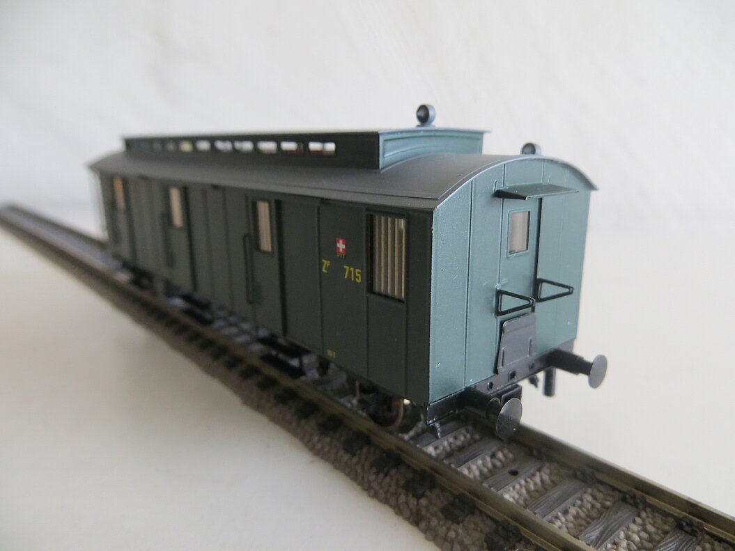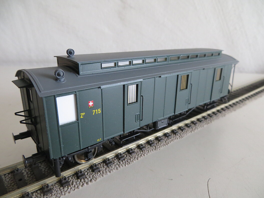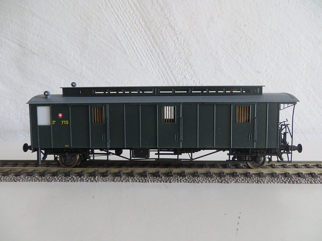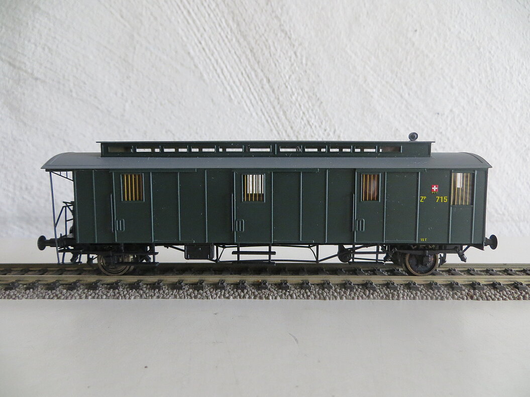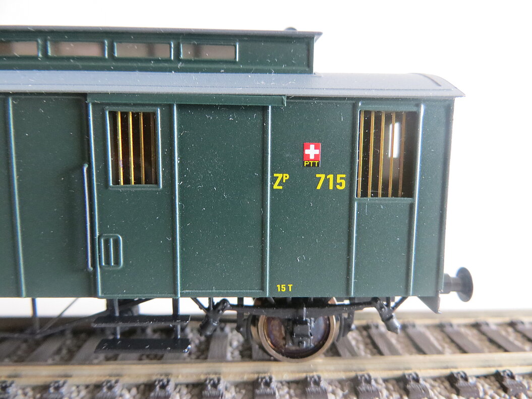 2-achsiges Messingmodell mit schwarzem Rahmen, grünem Aufbau und dunkelgrauem Dach, Oblichter, 2 Dachlüfter, Bremsplattform nur einseitig, Scheibenräder, Federpuffer, Anschrift “Zp 715” und PTT-Logo, Normschacht, LüP. 150 mm