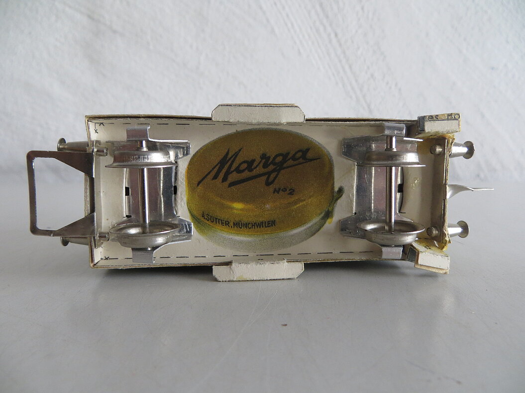 Die älteren Semester unter den Sammlerfreund*innen werden die MARGA-Schuhwichse noch kennen, ob aus praktischer Anwendung oder nur vom Hörensagen. Die Firma MARGA aus dem thurgauischen Münchwilen offerierte in den frühen 50er-Jahren zu ihren Schuhpflegeprodukten verschiedene Bastelbogen, mit denen sich Personen- und Güterwagen nach Vorbildern der SBB zusammenbauen liessen. Die Bastelbogen wurden gemäss Mikado von ERGA (Ernst Ganzer, Berlin-West) gefertigt; allerdings findet sich weder auf den Kartonbogen ein Hinweis auf die Druckerei noch sind die Blechteile irgendwie gemarkt.