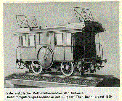 Auszug aus der Broschüre “100 Jahre Schweizerbahnen” des Publizitätsdienstes SBB (Bern 1947) mit der Drehstromgüterzugs-Lokomotive der Burgdorf-Thun-Bahn, der ersten elektrischen Vollbahnlokomotive der Schweiz, erbaut 1899, Seite 22