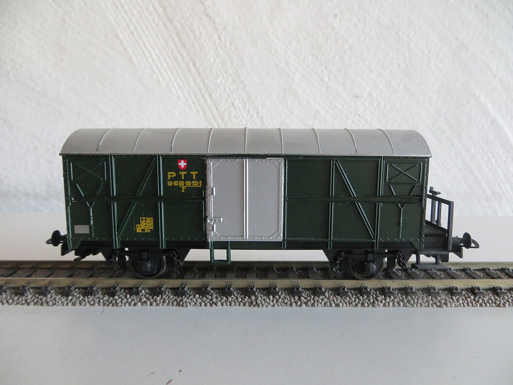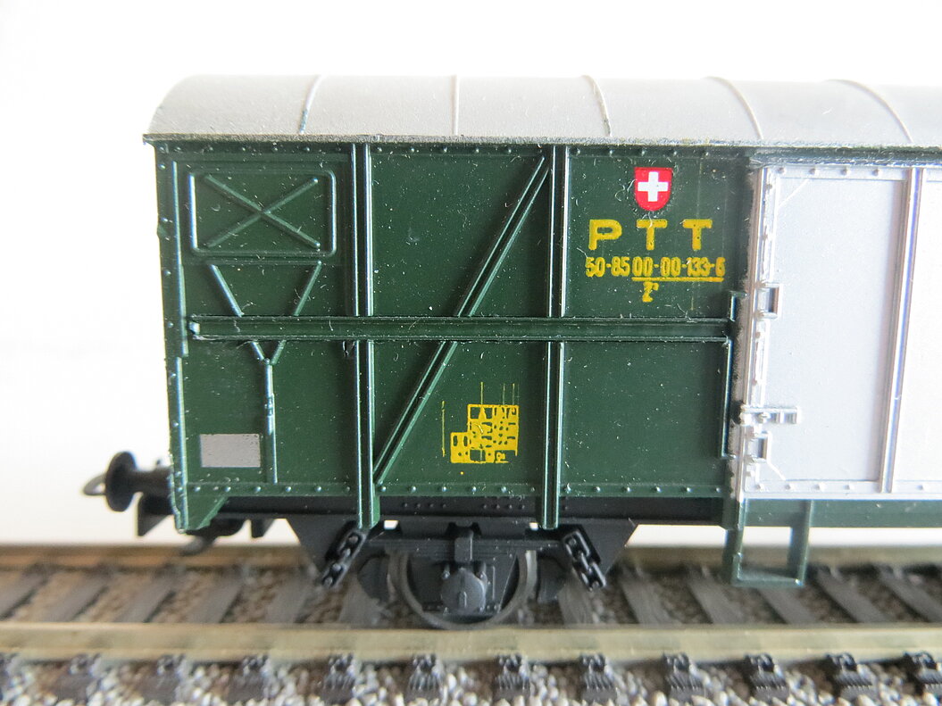 2-achsiges Kunststoffmodell, schwarzer Rahmen mit Bremserplattform, grüner Aufbau, silberfarbenes Dach und Schiebetüre, gelbe Anschriften mit dem alten PTT-Logo, ohne Normschacht, LüP. 127 mm