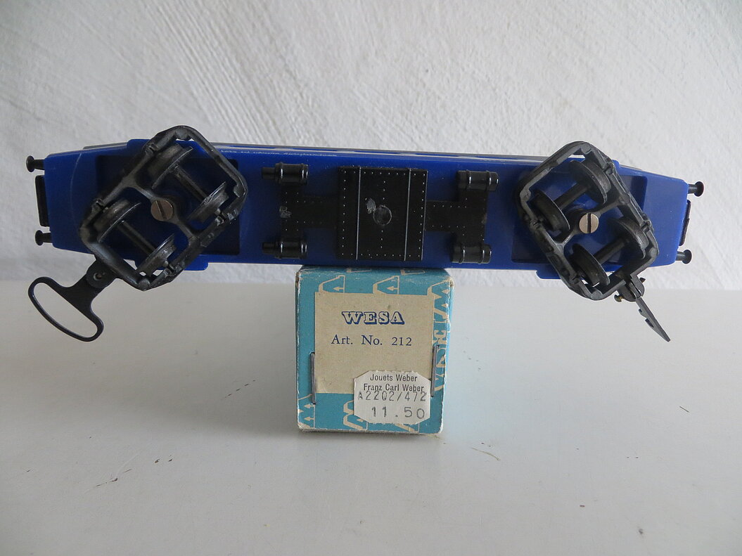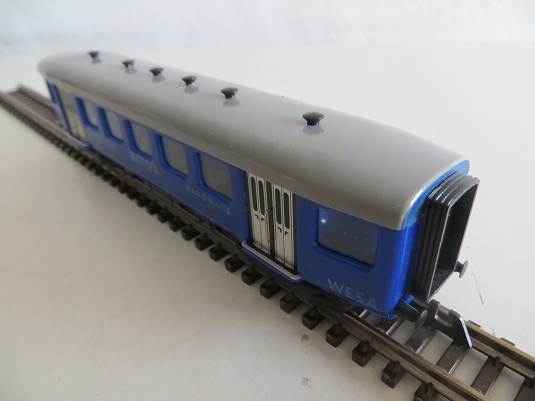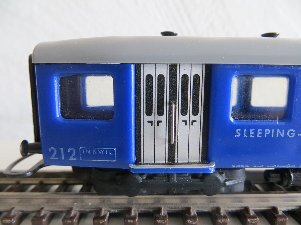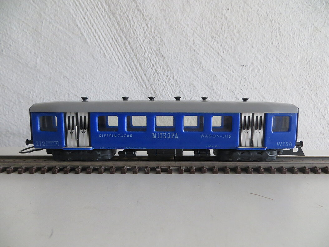 4-achsiges Kunststoffmodell, blauer Wagenkasten, hellgraues abnehmbares Dach mit 6 aufgesteckten schwarzen Lüftern, schwarze Drehgestelle aus Guss, schwarze Bodenarmaturen und Faltenbälge aus Kunststoff, weisse gedruckte Anschriften "MITROPA" und “Sleeping-Car” bzw. "Wagon-Lits", 4 silberfarbene Türen (Aluplättchen geklebt), asymmetrische Kupplungen, schwarze lange Metallpuffer, LüP. 170 mm