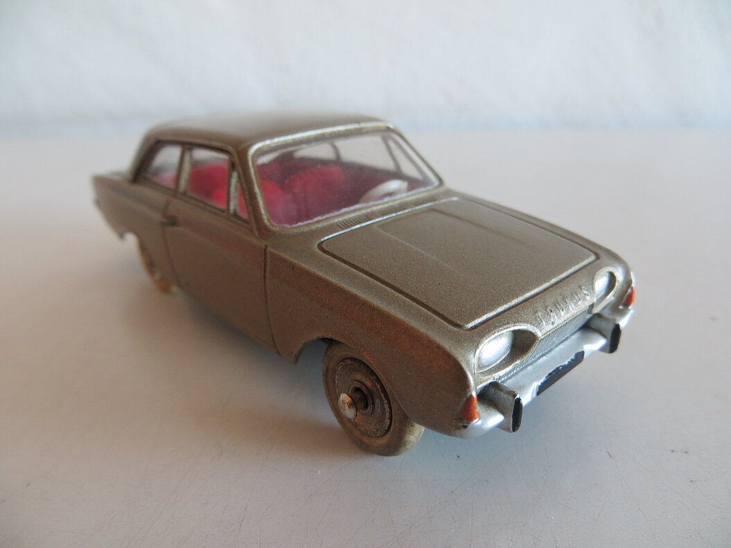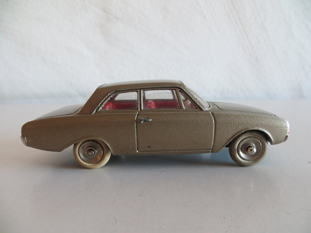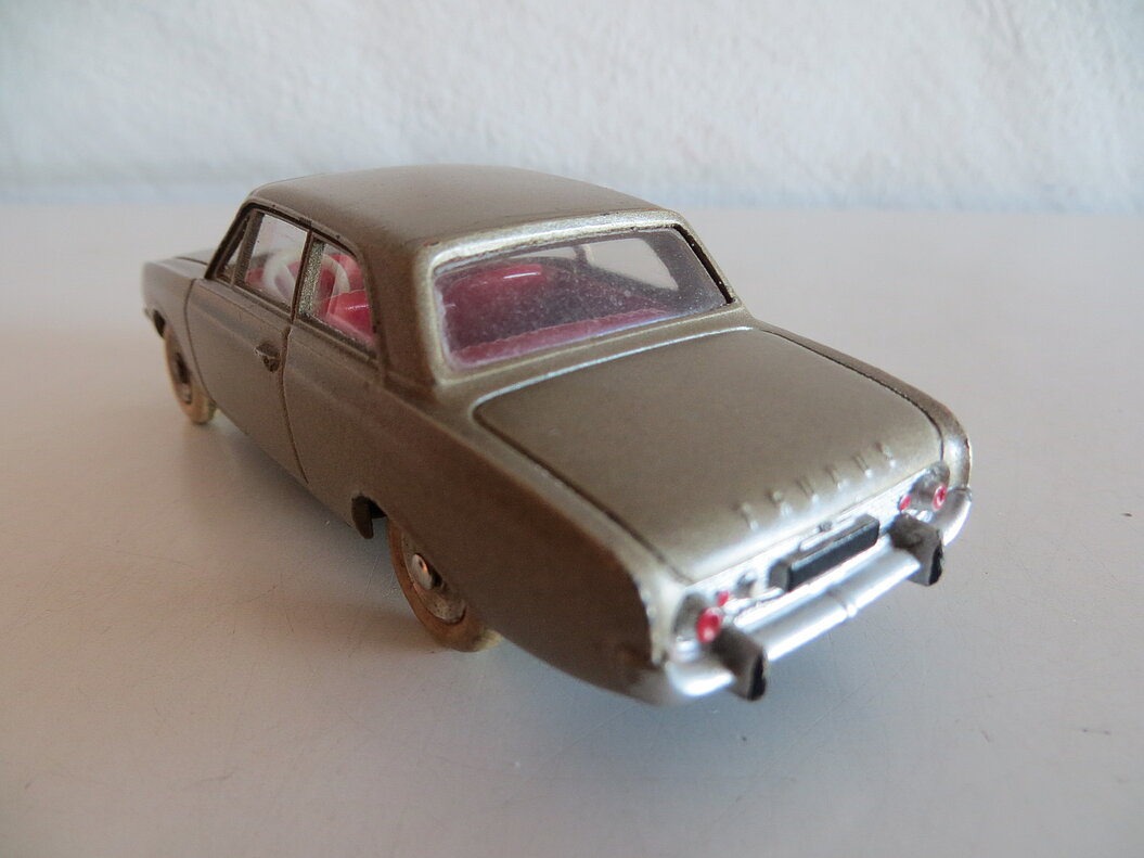 Goldbraunes Guss-Modell, Leichtmetall-Räder (vernickelt) mit weissen Pneus, schwarzes Bodenblech (genietet), silberfarbener Kühlergrill, vordere und hintere Stossstange sowie vordere Lampen, rot gemalte Rücklichter, erhabene Anschriften “TAUNUS” vorne und hinten, Fenster mit Cellons, rote Inneneinrichtung, weisses Lenkrad, Länge 104 mm