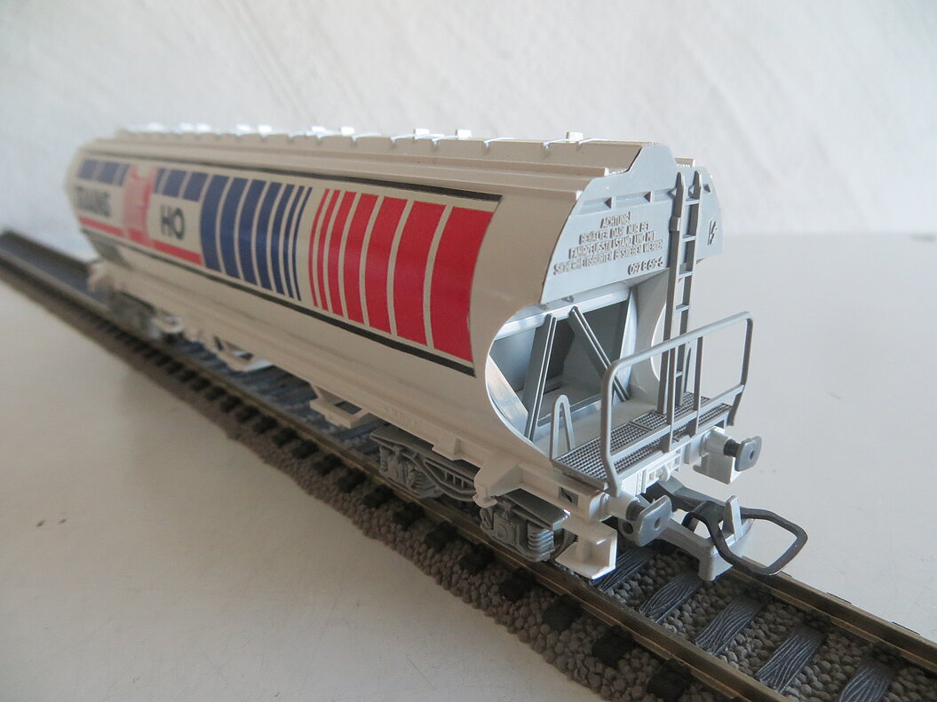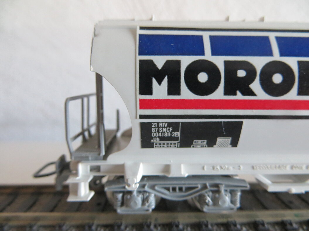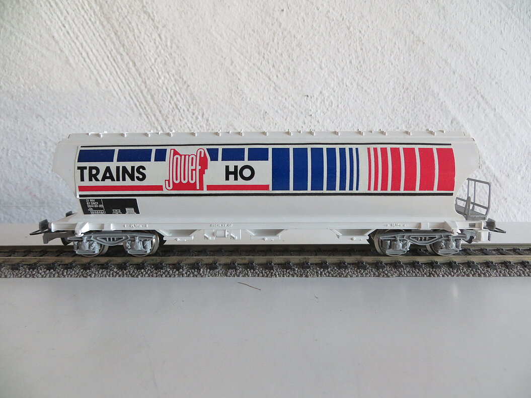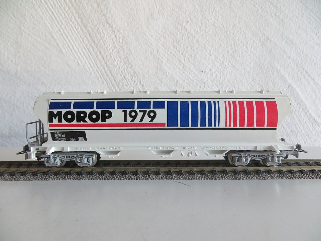 Besonderes: Die beiden Wagenseiten wurden von Jouef mit einem farbigen Kleber unterschiedlich gestaltet. Auf der einen Seite ist das Firmenlogo von Jouef mit der Aufschrift “TRAINS H0” zu sehen, die andere Wagenseite trägt einen gleich gestalteten Kleber mit der Aufschrift “MOROP 1979”.