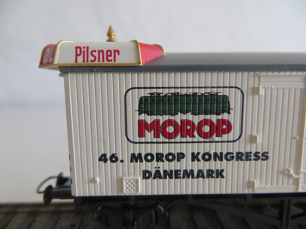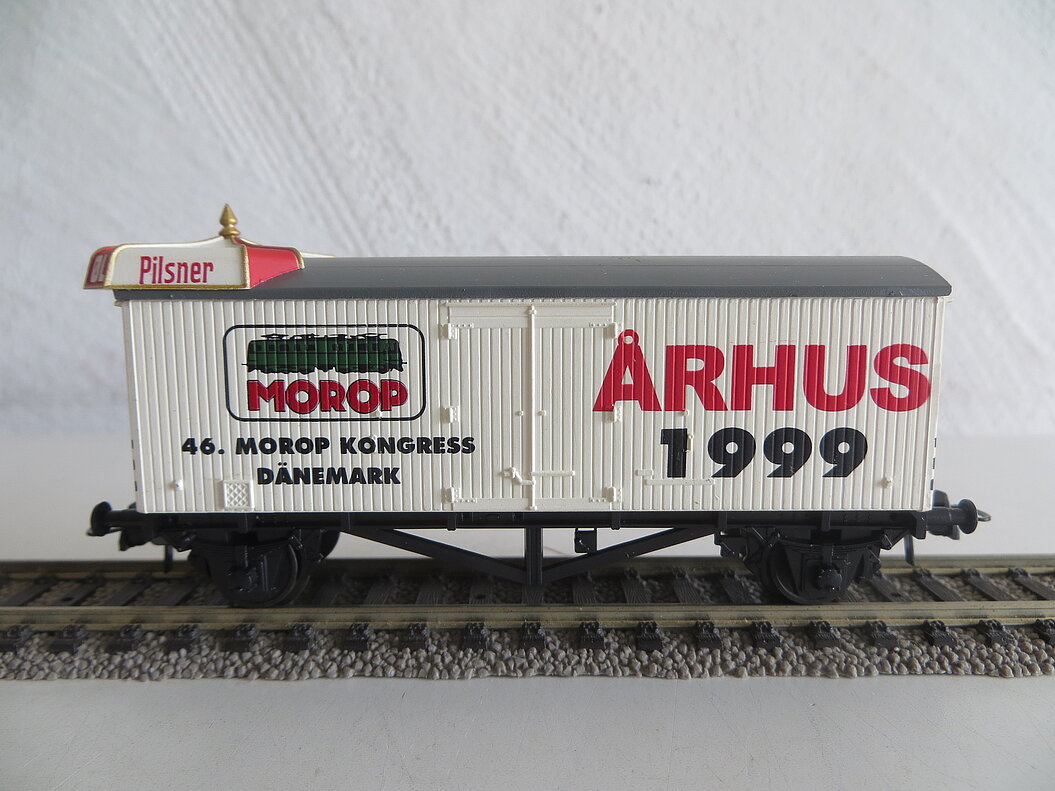 Besonderes: Gedruckte Anschriften auf zwei völlig unterschiedlichen Wagenseiten: “46. MOROP KONGRESS DÄNEMARK ÅRHUS 1999” und MOROP-Logo bzw. klassischer TUBORG-Schriftzug, wie es ihn auch bei anderen Herstellern (Liliput, Pocher) gibt. Der Wagen ist noch nicht zugerüstet.