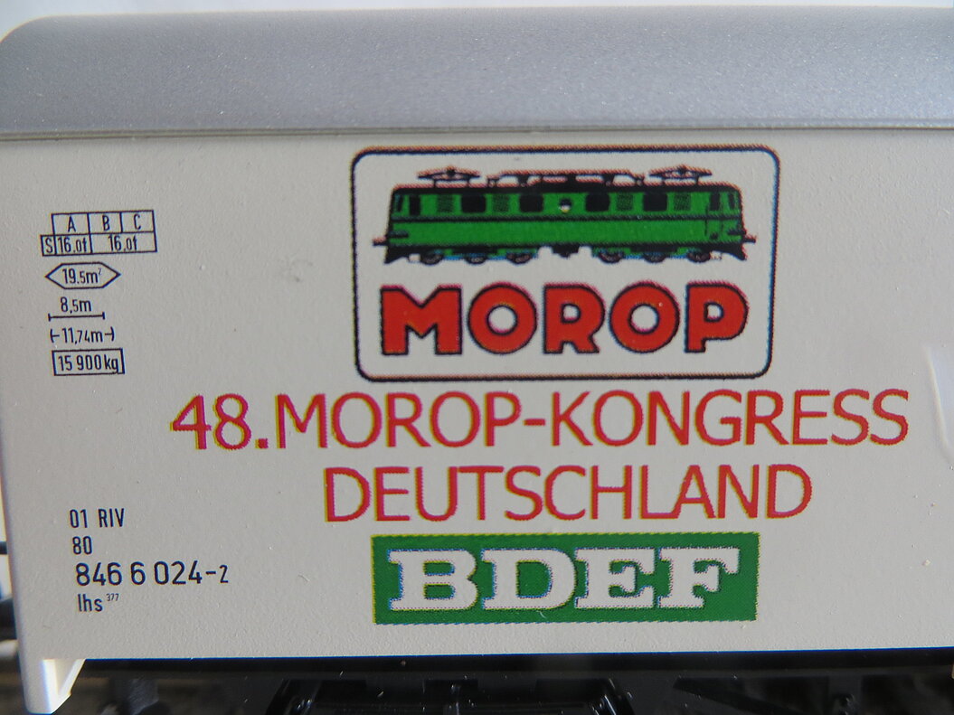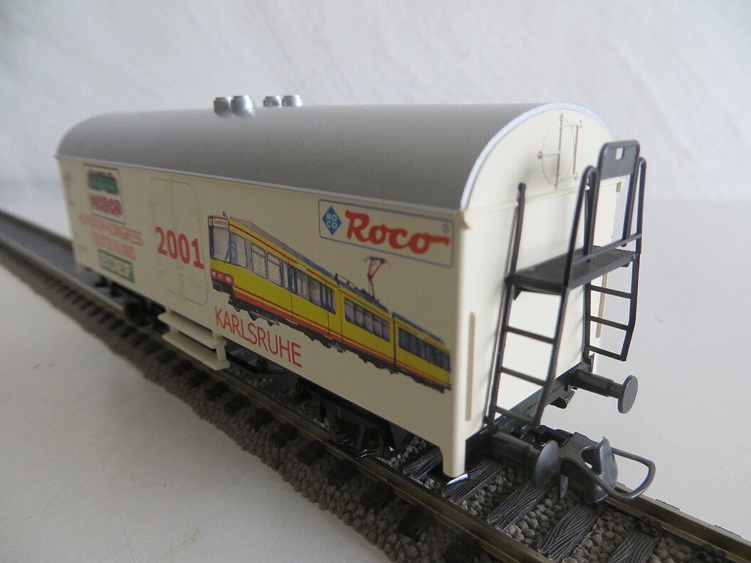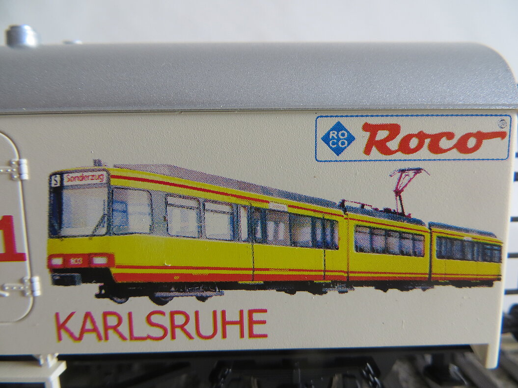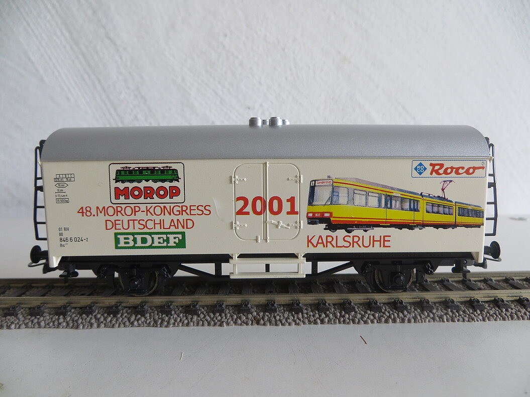 Besonderes: Gedruckte Anschriften “48. MOROP-KONGRESS DEUTSCHLAND 2001”, Logo von MOROP und BDEF, Abbildung einer gelben Karlsruher Stadtbahn sowie Roco-Logo.